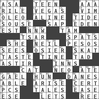 ACROSS 1. White ___ sheet 4. Adolescent 8. American Automobile Association (abbr.) 11. Cause heat under the collar 13. Viva Las _ 15. Zeal 16. Margarine 17. Place in a line 18. Event that recurs at intervals 19. Boozer 21. Plant excrement 22. Paradise 23. Eastern Standard Time (abbr.) 24. Compass dir. 27. Scottish cap 29. Russian ruler of old 30. Arguments over trivial matters 34. A female animal or person 36. Famous astronaut Armstrong 39. Mexican monetary units 40. Observes 41. Flexible twig of a willow tree 43. Three-handed card game 44. Clothes sense 46. Prong on a fork 47. Bit 48. Moving or stirring 49. Restaurants 51. Feline 53. Modern: prefix 54. Had dinner 57. Highlander 60. Attila the _ 63. Natives or inhabitants of Denmark 65. Competent 66. Ascend 69. Sure thing 70. Personal Computers (abbr.) 71. Stories 72. Relaxation 73. Compass dir. 74. Allows 75. To sift DOWN 1. Came up 2. Grain storage towers 3. Native American of Southwest Alaska 4. Federal power corp. 5. Snakelike fish 6. The front part of a cuirass 7. Nanny 8. Enthusiastic 9. Helper 10. So be it 12. Greek goddess of the dawn 14. Back-to-school mo. 18. Storms 20. Followers of ems 25. Billionth: prefix 26. Take or capture by force 28. Viper 29. A testis 31. "____ silly question..." 32. Frog relative 33. Fast jet (abbr.) 34. Oceans 35. Command 37. One more than two 38. Soviet premier 1918-24 40. R.R. building 42. French philosopher Descartes 45. Epoch 50. Dreamland 52. Not this but _ 54. Approach 55. Laconic 56. First name in cosmetics 57. Stare wonderingly 58. Lettered men learn these first 59. Otherwise 61. Mountain range 62. The longest river in the world 64. Adept person 67. Arrange properly for use 68. Double-curved letter