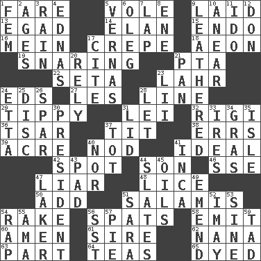 ACROSS 1. Conductor's collection 5. Short-tailed, large-bodied rat 9. Put down 13. Mild oath 14. Flair 15. Inside; within (prefix) 16. Count _ (2 wds.) 17. Streamer paper 18. Period of immesurable duration 19. Catching in a trap 21. Parent Teacher Assoc. 22. Bristle 23. Cowardly lion portrayer 24. Begley and Asner 27. French article 28. Actor's bit 29. Likely to tip or tilt 31. Luau accessory 32. Swiss mountan, "Queen of the Mountains" 36. Russian ruler of old 37. Teat (slang) 38. Blunders 39. Measure of real estate 40. Dreamland 41. Standard of perfection 42. Specific locale 44. Manchild 46. Compass dir. 47. One who doesn't tell the truth 48. Louse (plural) 50. Increase 51. Deli grouping 54. Libertine 56. Arguments over trivial matters 58. Give off 60. So be it 61. The founder of a family 62. Nanny 63. Piece 64. Beverages made from leaves 65. Colored DOWN 1. Opposite of masc. 2. Eras 3. Precipitation 4. Ferber et al. 5. Actresses Bloom and Felton 6. Cassini of fashion 7. Infant locale 8. Compass dir. 9. Resembling or made to resemble leather 10. Approach 11. Wedding promise 12. Spanish title 17. Quote 20. Trust 21. Baking dish 23. Cards in a Roman deck? 24. Singer James 25. Compact _ 26. Practice fight 28. Allow 30. Elected leader of a country 31. Hat (slang) 33. Angers 34. Pate de foie ____ 35. Small island 37. Small child 40. And not 41. South American Indian 43. Groovy apt. 44. Chalkboards 45. Petroleums 47. Member of a famous L.A. basketball team 49. Make improvements or corrections to 51. "Two Mules for Sister ____" 52. "If ____ say so..." 53. Trig term 54. Strike 55. Nursemaid (var.) 56. Fast jet (abbr.) 57. Sliced dessert 59. Small boy