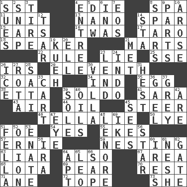 ACROSS 1. Fast jet (abbr.) 4. Singer Brickell 8. Health resort 11. A single undivided whole 13. Billionth: prefix 14. Practice fight 15. Hearing organs 16. It was, poetically 17. Pacific island yam 18. Orator 21. Shops 22. Governing power 23. Whopper 25. Compass dir. 26. Big collection agency 29. Veterans Day date 32. Team commander 34. Indiana (abbr.) 35. Ovum 38. Singer James 39. Twentieth part of a lira 41. "Two Mules for Sister ____" 43. Wind 44. Lubricate 45. Guide 46. Copy Pinocchio 50. Sodium hydroxide 51. Enemy 54. It is so 55. Makes supply last 57. Bert's buddy 59. Inhabiting a nest 63. One who doesn't tell the truth 64. In addition 67. Length times width 68. Globular water bottle used in Asia 69. Lightbulb-shaped fruit 70. State of inaction 71. One (Scot) 72. Drink excessively 73. A female animal or person DOWN 1. Takes to court 2. Fastener 3. Become fatigued 4. Main course 5. Simpleton 6. _ tizzy (2 wds.) 7. Greek goddess of the dawn 8. Practice fights 9. Pieces 10. Came up 12. Russian ruler of old 14. R.R. building 19. Malaysian steamed pastry 20. Pipe bend 21. Was introduced to 23. Grant temporary use of 24. Southeast Asian peninsula 26. Frozen water 27. Roll call or roster of names 28. Suttee (variant) 30. Country estate 31. Behest 33. Haul 36. Highlander 37. Jennifer or Joel 39. Not divided or shared with others 40. Lubricates 42. "We ___ not amused" (Victoria) 45. Observes 47. Sight organ 48. Poe poem 49. D.D.E's nickname 51. Man or boy (slang) 52. Greek mythologigal hunter 53. Maternal 56. Play the lead 58. Lyricist Gershwin 60. Angers 61. Tender 62. Yard entry 64. Fitting 65. Lion 66. Plant excrement