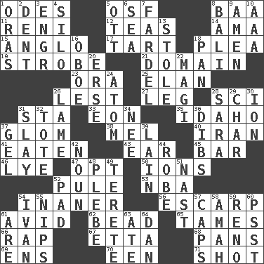 ACROSS 1. Lyric poems 5. Order of Saint Francis (abbr.) 8. Sound made by sheep 11. Painter Guido (1575-1642) 12. Beverages made from leaves 14. Housemaid (var.) 15. White American of non-Hispanic descent 17. Small pie 18. Entreaty 19. Disco prop 21. Realm 23. Mouth or opening 25. Liveliness 26. For fear that 27. Part of a journey 28. _-fi 31. R.R. building 33. Period of immesurable duration 35. Potato state 37. Take by theft 38. Cartoonist voice _ Blanc 40. SW Asia republic 41. Eroded 43. Hearing organ 45. Drinking establishment 46. Sodium hydroxide 47. Elect 50. Charged atoms 52. Whine 53. Basketball assoc. 54. More lacking in sense or substance 56. Fortification 61. Enthusiastic 62. Necklace unit 65. Makes less strong or intense 66. Hit sharply and swiftly 67. Singer James 68. Baking dishes 69. Followers of ems 70. Car or cant ending 71. Guess DOWN 1. Mouths or openings 2. Undesirable depression on a surface 3. Engineer (abbr.) 4. Grain storage tower 5. Baseball player Mel 6. Ocean 7. Burden 8. Indonesian resort city 9. So be it 10. American Automobile Association (abbr.) 13. Took without asking 16. Mitch Miller's instrument 18. Baking dish 20. Celtic language 22. Wise men 24. Smallest unit of an element 26. Unable to walk 28. "Two Mules for Sister ____" 29. Burn to charcoal 30. Electrically charged atom 31. Kill 32. Carryall 34. Born 36. Rights 37. Set 39. (Had) reclined 42. Part of speech 44. Loose flowing garment 48. First-year military academy student 49. Cigar-shaped 51. Political cartoonist Thomas 52. Writing tablet 54. "Terrible" tsar 55. Cuts off 57. Smile enhancers 58. Housemaid 59. Western Nevada city 60. Inconspicuous attention getter 61. "We ___ not amused" (Victoria) 63. Had dinner 64. Daniel's nick name