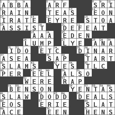 ACROSS 1. Swedish rock group 5. Sandy's bark 8. Indian title of respect (Mr.) 11. Precipitation 12. Beverages made from leaves 14. A really long time 15. Feeling or showing extreme anger 17. Jane of fiction 18. Portico 19. Help 21. Outscore 23. American Automobile Association (abbr.) 25. Locale of original sin 26. Mass 27. Sodium hydroxide 28. Santa ___, CA 31. Wedding promise 33. And so on (abbr.) 35. Middle Eastern gold or silver currency 37. At sea 38. Plant excrement 40. Small pie 41. Hits or strikes with great force 43. Affirmative reply 45. Affectionate concern, for short 46. For each 47. Snakelike fish 50. In addition 52. We are 53. Hit sharply and swiftly 54. Gillaume's butler role 56. Gossips 61. Cole _ (cabbage dish) 62. Texas town _ City 65. Allots cards 66. Greek goddess of the dawn 67. One of the Great Lakes 68. Narrow board 69. Adept person 70. Car or cant ending 71. Coop moms DOWN 1. Operatic vocal solo 2. Taverns 3. Prejudice 4. Opposed to 5. Had dinner 6. Marina Del _, California 7. Burden 8. Bristle 9. Carrot, for example 10. _ tizzy (2 wds.) 13. Morally degraded 16. He sold his birthright 18. Elected rep. 20. Docile 22. Nourish 24. Flats, for short 26. Rich soil 28. Of or related to the anus 29. Drug cop 30. Tate display 31. Small island 32. Letter starter 34. Island 36. "Tell ____ the Marines!" 37. Viper 39. Lightbulb-shaped fruit 42. Observes 44. Kill 48. Wear away 49. Poe poem 51. Drove too fast 52. Compass dir. 54. Alliance 55. Comfort 57. Tender 58. Lie 59. Actor Alda or Thicke 60. Fast planes 61. Ocean 63. Expire 64. Lair