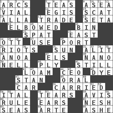 ACROSS 1. Arches 5. Afternoon social gatherings 9. At sea 13. Small bottle 14. Armor plate that protects the chest 15. Scram, to a cat 16. Silent film actress Nazimova 17. Barter 18. Stalk of a moss capsule 19. Shoved, as through a crowd 21. Storage container 22. Argument over a trivial matter 23. 90 degrees 24. Baseball player Mel 27. Purpose 28. Sweet dark-red dessert wine 29. Debaucheries 31. Player for Phoenix 32. Set down 36. Small Philippine buffalo 37. Raised railways 38. Billionth: prefix 39. 1994 drama film starring Jodie Foster 40. Apply oneself diligently 41. Free of sound 42. Rich soil 44. Corporate head (abbr.) 46. Color 47. Comedian Laurel of Laurel & Hardy 48. Relating to the mouth 50. 4-wheeled motor vehicle 51. Borne 54. Slanted text style (abbr.) 56. Rends 58. Opinion 60. Court order 61. Hearing organs 62. Delicate 63. Oceans 64. Johnson of "Laugh-In" 65. American tennis player Robert DOWN 1. Actress Gardner 2. Cause heat under the collar 3. Give a ring to 4. Thick slices 5. Cylindrical with tapered ends 6. Mild oath 7. Help 8. Compass dir. 9. Aide 10. Odor 11. Erode 12. "One Day ___ Time" 17. It was, poetically 20. Musical composition 21. Oblong piece of solid material 23. A really long time 24. Northwest Algerian city 25. Prong on a fork 26. Instrument 28. Product of festering 30. Baron Munchausen's specialties 31. Stealthy 33. Put down 34. In an inward manner 35. Lacquered or enameled metalware 37. Shade tree 40. Baking dish 41. Fly high 43. Rowing implement 44. Rough 45. Blunders 47. Any of the three canals of the cochlea 49. Climbing, woody, usually tropical vines 51. Draw slowly or heavily 52. Nights before holidays 53. Food container 54. Big collection agency 55. Third day of the wk. 56. Beverage made from leaves 57. Ewer handle 59. A female animal or person