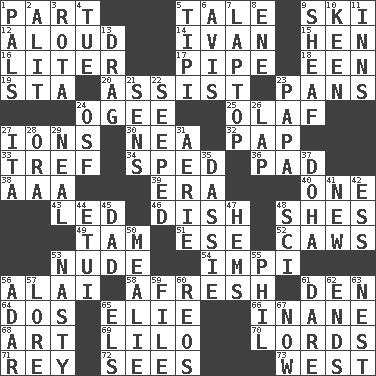 ACROSS 1. Role in a play 5. Lie 9. What Jean-Claude Killy likes to do 12. Verbally 14. _ the terrible 15. Layer 16. 61 cubic inches 17. Corncob 18. Car or cant ending 19. R.R. building 20. Help 23. Zero-star reviews 24. Double curve, resembling the letter S 25. Norwegian king 27. Charged atoms 30. Teachers' org. 32. Infant food 33. Unclean, religiously 34. Moved rapidly 36. Writing tablet 38. Auto club (abbr.) 39. Period 40. Single 43. Directed 46. Food container 48. "______ My Girl" (Turtles hit) 49. Scottish cap 51. Compass dir. 52. Crow sounds 53. Naked 54. Body of Kaffir warriors 56. Jai ____ 58. Anew 61. Lair 64. Two (Sp.) 65. Writer Wiesel 66. Lacking in sense or substance 68. Tate display 69. _ and Stitch 70. Titled peers of a realm 71. Marina Del _, California 72. Perceives with the eye 73. Compass direction DOWN 1. Friends 2. Set down 3. Roll call or roster of names 4. Third day of the wk. 5. Native american tent (variation) 6. Opinion 7. Portable computer 8. Compass dir. 9. Archer's quiver 10. Peachy ____! 11. Lodging establishments 13. To be drawn or hauled along 21. Elected reps. 22. Oozed 23. Dad 24. Order of Saint Francis (abbr.) 26. Pet locale 27. Call ___ day 28. Mouth or opening 29. Be tempered by heat 31. Nest on high 35. Small ungulate mammals of Africa 37. Capital of the state of Qatar 41. ___ Haven, CT 42. Curvy letter 44. Needle case 45. June honoree 47. Is hesitant and indecisive 48. _-fi 50. Ear of corn 53. Difficult 55. Silvers or Donahue 56. The sixth month of the Jewish calendar 57. Old wives' tales, e.g. 59. Do some clerical work 60. Vintage cars 61. Have the gumption 62. Conclusions 63. Egg locale 65. Raised railways 67. Immediately