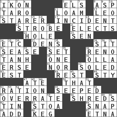 ACROSS 1. Picture 5. Raised railways 8. Viper 11. Edible starchy tuberous root 12. Rich soil 13. Lion 14. A viewer who gazes fixedly 17. Happening 19. Disco prop 21. Opts 22. Hollow 23. Elected rep. 24. And so on (abbr.) 27. Lairs 29. Be seated 32. Gospel singer Marvin 34. Put into a specified state 36. Western Nevada city 37. Hyperbolic tangent 38. Single 39. Spanish pot 40. Celtic language 41. And not 42. Having a sole or soles 43. Eastern Standard Time (abbr.) 44. Relief 46. Filthy place 47. Had dinner 50. Not this but _ 52. Food allowance for one day 55. Oozed 57. Make much ado about nothing 59. Tears up 62. Metal container 63. Portico 64. Fastener 65. Find the sum of 66. Barrel 67. Inactive volcano in Sicily DOWN 1. ___ a Wonderful Life 2. Krazy ___ of comics 3. Mouths or openings 4. Compass direction 5. Period of immesurable duration 6. Shoestrings 7. Grin 8. Actor Baldwin 9. Transmitted 10. Cooking vessels 12. Whopper 15. Eat (away) 16. Hero or heavy, e.g. 18. Lair 20. Gillaume's butler role 24. First name in cosmetics 25. Lacerates 26. 2nd pers. sing. pres. of can (arch.) 28. Sir (Sp.) 29. Exchanges for money 30. An arm off of a larger body of water 31. Sycophant 33. A female animal or person 35. Cylindrical with tapered ends 36. Friend of Pooh 42. Staphylococcus 45. "______ My Girl" (Turtles hit) 47. Wind 48. Cod relative 49. Related on the mother's side 51. Laconic 52. Roll call or roster of names 53. Enthusiastic 54. Be inclined (to) 55. Ocean 56. Undesirable depression on a surface 58. Coat; cloak 60. One of the 12 tribes of Israel 61. Health resort