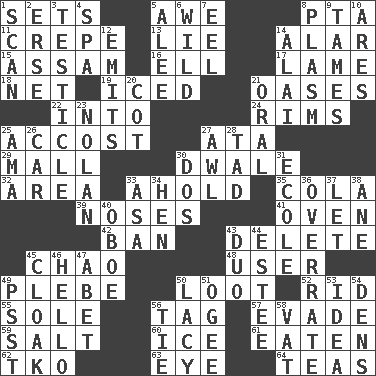 ACROSS 1. Arranges properly for use 5. Deep reverence 8. Parent Teacher Assoc. 11. Streamer paper 13. Whopper 14. Having or resembling wings 15. Indian state 16. Pipe bend 17. Unable to walk 18. Remaining after all deductions 19. On the rocks 21. Fertile tracts in a desert 22. To the inside or interior of 24. Basketball hoops 25. Buttonhole 27. _ moment's notice (2 wds.) 29. Shopping center 30. A sleeping potion; an opiate (poet.) 32. Type of rug 33. Hold, grip (Informal) 35. Root beer relative 39. Olfactory organs 41. Baking chamber 42. Forbid 43. Erase 45. US Secretary of Labor Elaine L. _ 48. One who uses or employs something 49. First-year military academy student 50. Spoils 52. To free from 55. Not divided or shared with others 56. Label 57. Elude 59. Table seasoning 60. Frozen water 61. Eroded 62. Ring climax 63. Sight organ 64. Afternoon social gatherings DOWN 1. Examine minutely or intensely 2. Celtic language 3. One of the two male reproductive glands 4. Health resort 5. Toward shelter 6. Rampant 7. Snakelike fish 8. Suffix with ecto or cyto 9. Domesticates 10. Ancient Greek god of war 12. Gives off 14. Jai _ 20. Small bed 21. Relating to the mouth 23. Pitcher Ryan 25. Wet nurse (var.) 26. 4-wheeled motor vehicle 27. Leather borer 28. Bit 30. Two (Sp.) 31. Learning spot: Fr. 33. White ___ sheet 34. Layer 36. Make much ado about nothing 37. Allow 38. One (Scot) 40. Mitch Miller's instrument 43. Superhero pair 44. First name in cosmetics 45. Cover or conceal 46. Phone greeting 47. Collude with 49. Inconspicuous attention getter 50. Made of lace 51. Double curve, resembling the letter S 53. The content of cognition 54. Hiding places for outlaws 56. Make a knot 58. Large container