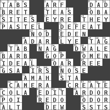 ACROSS 1. Bar bills 5. Sandy's bark 8. Male parent 11. Cy Young winner Saberhagen 12. Beverages made from leaves 14. Chief or king in Benin or Nigeria 15. Settings 17. Jane of fiction 18. Those things 19. Soft color 21. Outscore 23. Allow head to fall sleepily 25. Genesis locale 26. The sixth month of the Jewish calendar 27. Potassium hydroxide 28. Label 31. Bar bill 33. Tired old horse 35. A sleeping potion; an opiate (poet.) 37. Sharp remark 38. Grand Old Party 40. Sign of something about to happen 41. Perfect 43. Boat paddle 45. To separate or throw off 46. Girls' org. (abbr.) 47. Big collection agency 50. Characteristic smell of wine 52. Housemaid 53. R.R. building 54. Device for capturing images 56. Make 61. Root beer relative 62. Prepare for publication 65. Zeal 66. Luau course 67. Do over again 68. Aroma 69. The first octave above the treble staff 70. Morning condensation 71. Fast planes DOWN 1. Cook's measure (abbr.) 2. Operatic vocal solo 3. Stakes 4. Proofreading order 5. Had dinner 6. Marina Del _, California 7. Burden 8. Capital of the state of Qatar 9. Collude with 10. 24 hours 13. Morally degraded 16. Transmit 18. "___ Little Indians" 20. Grant temporary use of 22. Nourish 24. To be drawn or hauled along 26. Swedish rock group 28. Not wild 29. Toward shelter 30. Commissioned military rank (abbr.) 31. Small amounts or degrees 32. Length times width 34. Thick or sticky substance 36. Had on 37. Large 39. Baking dishes 42. Citrus frut 44. College mil. group 48. More valued for its uncommonness 49. Cast a shadow over 51. "Two Mules for Sister ____" 52. Wet nurse (var.) 54. Calm and collected 55. Set down 57. Greek god of love 58. Sums up 59. A blast of a horn 60. Blunders 61. Numbers guy (abbr.) 63. Binary compound 64. Pull behind