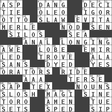 ACROSS 1. Cleo's killer 4. Mild oath, euphamism for damn 8. Tenth: prefix 12. Standoff 13. Margarine 14. Russian composer Stravinsky 15. "Beetle Bailey" pooch 17. Cole _ (cabbage dish) 18. Webber/Rice musical 19. Haggard of country music 21. Lower and raise head in agreement 23. Elected rep. 24. Grain storage towers 26. Ocean 28. Of or related to the anus 30. Yearning 34. Deep reverence 37. Ear part 39. Arab leader 40. Directed 41. Collection of objects 43. According to 44. Without 46. Colored 47. Affirmative reply 48. Speakers 51. Travel on or in a vehicle 54. Auto club (abbr.) 55. Laconic 58. Plant excrement 61. John Ritter's dad 63. Parts of speech 65. Agitate, as a liquid 67. Wise men 71. Trig term 72. "Corrida" creature 73. So be it 74. Third day of the wk. 75. Arranges properly for use 76. Broke a traffic law 77. Small drink DOWN 1. Smallest unit of an element 2. Locates 3. _ dish (used to culture cells) 4. Two (Sp.) 5. 100% 6. Teachers' org. 7. Bride's dress 8. HTML Container Element 9. The front part of a cuirass 10. ____ d'Azur (French Riviera) 11. SW Asia republic 16. Spanish pot 18. Locale of original sin 20. Period of immesurable duration 22. Bear (Spanish) 25. Table seasoning 27. Personal question 29. Nobles 30. Crowbar 31. "If ____ say so..." 32. Mediterranean tributary 33. Pate de foie ____ 34. In addition 35. Erode 36. Pulitzer Prize-winning author Ferber 38. Male child 42. Prepare for publication 45. R.R. building 49. Pledge 50. Actress Charlotte 52. Lair 53. Greek god of love 56. Costumes for special activities 57. World-weariness 58. Fast planes 59. _ vera 60. Sweet dark-red dessert wine 62. Dec. holiday 64. Ooze 66. Mayday 68. Electrical Unit 69. Unit of force equal to gravity 70. Working for oneself (abbr.)