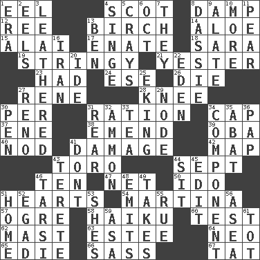 ACROSS 1. Snakelike fish 4. Highlander 8. Moist 12. To riddle 13. A tree used for making furniture 14. _ vera 15. Mountain range southwest of Kyrgyzstan 17. Maternal 18. "Two Mules for Sister ____" 19. Slender, wiry 21. Of or pertaining to yesterday 23. Possessed 24. Compass dir. 26. Pass on 27. French philosopher Descartes 28. Leg joint 30. For each 31. Food allowance for one day 34. Head covering 37. Compass dir. 38. Make improvements or corrections to 39. Chief or king in Benin or Nigeria 40. Lower and raise head in agreement 41. Break 42. Atlas unit 43. "Corrida" creature 44. Back-to-school mo. 46. Nine, plus one 47. Remaining after all deductions 50. Wedding promise 51. Centers 54. Chrissie's court nemesis 57. Legendary monster 58. Japanese poetic form 60. Trial 62. Vertical spar for supporting sails 63. First name in cosmetics 64. Modern: prefix 65. Singer Brickell 66. Backtalk 67. Make lace DOWN 1. Period 2. Snakelike fish 3. Resembling or made to resemble leather 4. Scorch 5. Trading vessels 6. Sep. follower 7. Those people 8. Small ungulate mammals of Africa 9. Having winglike extensions 10. Greater amount 11. Lightbulb-shaped fruit 13. Benjamin's nick name 16. SW Asia republic 20. Binary compound 22. Locale of original sin 25. Supplementing with great effort 27. Western Nevada city 29. Connecting point 30. Animal enclosure 31. Bring up, as a child 32. ID or VA city 33. Afternoon social gathering 34. Part 35. Blind as ____ 36. Infant food 41. Do not 43. Cylindrical with tapered ends 44. Be seated 45. Prepare for publication 46. Tarsus (plural) 48. Sends forth 49. Proceeds 51. Residence 52. Mild oath 53. "______ My Girl" (Turtles hit) 55. Sorrow 56. At sea 59. White ___ sheet 61. Small child