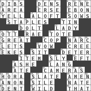 ACROSS 1. Rights 5. Cub Scout units 9. French philosopher Descartes 13. Type of rug 14. Celtic language 15. Inky black, to poets 16. Shout 17. High up in or into the air 18. Sty mamas 19. Paper fasteners 21. Shallow baking pan 22. Dunce 23. Kenny Rogers chart-topper in '80 24. Baseball player Mel 27. Actress Charlotte 28. Carry 29. Relatively large 31. Police officer (slang) 32. Drug cop 36. Allows 37. Promise 38. Algonquian 39. Supplements with great effort 40. Be seated 41. Prevent from occurring 42. A distinct part 44. Stealthy 46. Lizard (obsolete) 47. American tennis player Robert 48. Austrian-born American filmmaker Fritz 50. Had dinner 51. Devices for capturing images 54. Israeli folk dance 56. Chalkboard 58. So be it 60. At once, immediately (arch.) 61. Filth; sediment 62. Nathan's nickname 63. Gouge 64. Rampant 65. Not this but _ DOWN 1. 24 hours 2. Angers 3. Waist strap 4. Vegetable dish 5. Keyboard key 6. Greek god of love 7. Overdraft (abbr.) 8. Arrange properly for use 9. Home 10. Black 11. Immediately 12. Followers of ems 17. Silent film actress Nazimova 20. Sweet dark-red dessert wine 21. Make lace 23. Trim (branches) 24. Stare 25. Long journey 26. Wig 28. Pull behind 30. Helper 31. Small bed 33. Johnson of "Laugh-In" 34. Coral ridge 35. An absolute certainty 37. Zeal 40. Perceive with the eye 41. Centimeter-gram-second unit of force 43. Definite Article 44. Scheduled 45. Unable to walk 47. Composer Copland 49. Let have 51. Give a ring to 52. Nursemaid 53. Bristle 54. Possessed 55. Single 56. Compass dir. 57. Cards in a Roman deck? 59. Remaining after all deductions