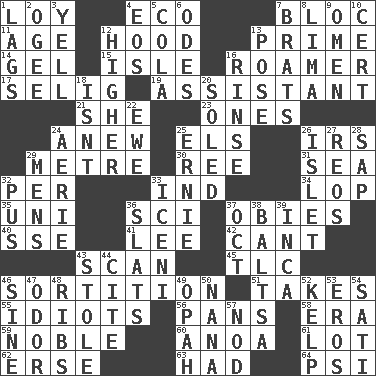 ACROSS 1. Myrna of the movies 4. Environmental prefix 7. Group of countries in special alliance 11. Grow older 12. Parka part 13. A-one 14. Set 15. Small island 16. Nomad 17. Major League Baseball Commissioner Bud 19. Helper 21. A female animal or person 23. Singles 24. Afresh 25. Raised railways 26. Big collection agency 29. Distance measurement (Brit.) 30. To separate or throw off 31. Ocean 32. For each 33. Indiana (abbr.) 34. Trim (branches) 35. Single; one (prefix) 36. _-fi 37. Off-Broadway awards 40. Compass dir. 41. Area sheltered from the wind 42. Patter 43. Skim 45. Affectionate concern, for short 46. Decision 51. Proceeds 55. Foolish or stupid persons 56. Baking dishes 58. Epoch 59. Having high moral qualities 60. Small Philippine buffalo 61. Car dealer's back yard 62. Celtic language 63. Possessed 64. Air pressure measure (abbr.) DOWN 1. Straggles 2. Double curve, resembling the letter S 3. Shout 4. Greek goddess of the dawn 5. Root beer relative 6. Lyric poems 7. Naughty children 8. Pale green bean 9. Sign of something about to happen 10. Sure thing 12. Having greater elevation 13. Airs 16. Wash lightly 18. Is not 20. Having a sole or soles 22. She-sheep 24. Nest on high 25. Bert's buddy 26. Small island 27. Vintage cars 28. Plant excrement 29. Not women's 32. Fluid product of inflammation 33. Ancient Celtic tribe of eastern Britain 36. Narrow boards 37. Sep. follower 38. Greek mezzo-soprano Agnes 39. South American Indian 43. Fur scarf 44. Quote 46. Trig term 47. Scent 48. Teases 49. Brightly colored fish 50. Grandmother 52. Seaweed 53. Greek god of love 54. Suttee (variant) 57. Allow head to fall sleepily