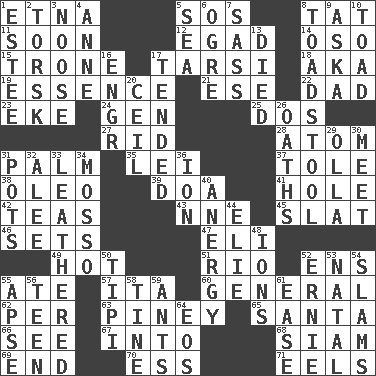 ACROSS 1. Inactive volcano in Sicily 5. Distress signal 8. Make lace 11. Within a short period 12. Mild oath 14. Bear (Spanish) 15. Heavy duty weighing machine 17. Tarsus (plural) 18. Alias (abbr.) 19. Core 21. Compass dir. 22. June honoree 23. Supplement with great effort 24. Commissioned mil. rank 25. Two (Sp.) 27. To free from 28. Smallest unit of an element 31. Inside of hand 35. Luau accessory 37. Lacquered or enameled metalware 38. Butter sub 39. ___ good deed 41. Opening into or through something 42. Beverages made from leaves 43. Compass dir. 45. Narrow board 46. Arranges properly for use 47. Biblical high priest 49. Being at a high temperature 51. River (Sp.) 52. Followers of ems 55. Had dinner 57. Call ___ day 60. Commissioned military rank 62. For each 63. Abounding in pines 65. Before Barbara or Clara 66. Observe 67. To the inside or interior of 68. Thailand, formerly 69. Conclusion 70. Curvy letter 71. Snakelike fish DOWN 1. First name in cosmetics 2. Cod relative 3. Trap for birds or small mammals 4. Queen of England 1702-14 5. Ocean 6. Legendary monster 7. Backtalk 8. Inedible or poisonous agaric 9. "____ silly question..." 10. Frog relative 13. Passed on 16. Engineer (abbr.) 17. Watched over 20. To provide with a ceiling 26. Profane or obscene expressions 29. Rounded earthenware pot or jar 30. Rendezvous 31. Plant holders 32. Toward shelter 33. Tough but pliablecoriaceous 34. With motion or animation 36. Electrically charged atom 40. Disorder of the immune system 44. Writer Wiesel 48. Charged atoms 50. Native american tent (variation) 52. Bert's buddy 53. Brizilian seaport 54. Shuts with force 55. Domed church section 56. Adolescent 58. Prong on a fork 59. Pismires 61. Comfort 64. Greek goddess of the dawn