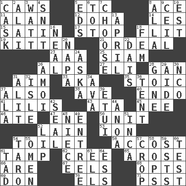 ACROSS 1. Crow sounds 5. And so on (abbr.) 8. Adept person 11. ____ Jay Lerner 12. Capital of the state of Qatar 14. French article 15. Smooth fabric 17. Obstruct or block passage 18. Sudden quick movement 19. Baby cat 21. Severe or trying experience 23. American Automobile Association (abbr.) 25. Thailand, formerly 26. High mountains 27. Biblical high priest 28. Separate the seeds from cotton 31. Direct toward a target or goal 33. Alias (abbr.) 35. Unemotional 37. In addition 38. "___ Maria" 40. Inside; within (prefix) 41. Ms. Damita and namesakes 43. _ moment's notice (2 wds.) 45. Born 46. Had dinner 47. Compass dir. 50. A single undivided whole 52. (Had) reclined 53. Electrically charged atom 54. Rest room 56. Buttonhole 61. Pack (down) 62. Algonquian 65. Came up 66. "We ___ not amused" (Victoria) 67. Snakelike fish 68. Elects 69. Spanish title 70. Raised railways 71. Inconspicuous attention getter DOWN 1. Keg 2. Jai _ 3. Electrical Unit 4. In a ____ (agitated or irritated) 5. Begley and Asner 6. Small child 7. Elect 8. Silent film actress Nazimova 9. To provide with a ceiling 10. Eastern Standard Time (abbr.) 13. Showery time 16. Actress Patricia 18. Opposite of masc. 20. California wine valley 22. Raised platform 24. "____ silly question..." 26. Mine, in Marseilles 28. Went 29. Assistant 30. Non-commissioned officer (abbr.) 31. Set down 32. Small island 34. Actress Gardner 36. Portable shelter 37. Insect wing 39. Needle case 42. Lick closed 44. Small Philippine buffalo 48. Sibling's daughter 49. Main course 51. South American Indian 52. Mouth edge 54. Edible starchy tuberous root 55. Presage 57. Riding implement 58. I made a mistake 59. Fast planes 60. Trial 61. Bit 63. Pipe bend 64. Curvy letter
