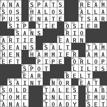 ACROSS 1. Santa ___, CA 4. Arguments over trivial matters 9. 480, 500 or 516 sheets of paper 13. Mayday 14. Rings 15. Silent film actress Nazimova 16. Product of festering 17. Maternal 18. Russian ruler of old 19. Small drink 21. Make a knot 22. Flexible twig of a willow tree 24. Without 26. _ de Janeiro 27. Nick name for Arthur 29. Merit 30. Actors Connery and Penn 31. Table seasoning 33. Scottish cap 36. Layer 37. More given to overacting 40. Housemaid (var.) 41. Newt 42. Corncob 43. Fourth or lowest deck 45. Blemish 47. Ms. Damita and namesakes 48. Ewer handle 49. Waist strap 50. Virtuous person 52. Not either 54. Erode 56. Disposed of to a purchaser 57. Falsehoods 59. Experiment locale 61. Heavy book 62. An arm off of a larger body of water 63. Australian flightless bird 64. Of or related to the anus 65. Sycophant 66. Put into a specified state DOWN 1. Viper 2. Good sense 3. Aide 4. A female animal or person 5. Leg coverings 6. Jai ____ 7. Carry 8. Compass dir. 9. Food allowance for one day 10. Otherwise 11. Having or resembling wings 12. Make imperfect 20. Ache 22. Declaim 23. Title for a knight 25. Soft 27. American tennis player Robert 28. Coral collection 29. Writer Wiesel 31. Stricken, poetically 32. Electrical Unit 33. Baron Munchausen's specialties 34. Mine, in Marseilles 35. Atlas contents 38. To the left, to Queeg 39. Hero or heavy, e.g. 44. Cause heat under the collar 45. Beer mug 46. Baking dish 49. A special lineage 50. Within a short period 51. _ mater 52. Billionth: prefix 53. Spanish pot 55. Docile 56. R.R. building 57. Teat (slang) 58. Filthy place 60. Yet