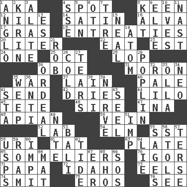 ACROSS 1. Alias (abbr.) 4. Blemish 8. Peachy ____! 12. "Death on the ____" 14. Smooth fabric 16. Inventor's middle name 17. Pate de foie ____ 18. Pleas 20. 61 cubic inches 22. Ingest 23. Eastern Standard Time (abbr.) 24. Single 25. Sep. follower 28. Trim (branches) 30. Mitch Miller's instrument 31. Person of subnormal intelligence 35. Armed conflict 37. (Had) reclined 40. Light colored 41. Post 42. Frees from moisture 44. _ and Stitch 45. Wig 46. Father 47. _ tizzy (2 wds.) 48. Bee-related 50. Distinctive style or manner 52. Experiment locale 54. Shade tree 55. Fast jet (abbr.) 58. RI univ. 61. Make lace 63. Food holder 65. Wine waiters 70. Russian composer Stravinsky 71. Dad 72. Potato state 73. Snakelike fish 74. Stricken, poetically 75. Greek god of love 76. Perceive with the eye DOWN 1. White American of non-Hispanic descent 2. Japanese brewing company 3. Having winglike extensions 4. Compass dir. 5. Baking dish 6. Baseball player Mel 7. Hoop that covers a wheel 8. Krazy ___ of comics 9. Writer Wiesel 10. Nights before holidays 11. Political cartoonist Thomas 13. Compass dir. 15. Actress Patricia 19. Smallest unit of an element 21. Director Reiner 26. Having a low temperature 27. Pulls apart 29. Cotton for raincoats, e.g. 30. Severe or trying experience 32. Precipitation 33. Spanish pot 34. Modern: prefix 35. Shed a tear 36. Against 38. One more than two 39. Effrontery 41. R.R. building 43. Sew up the eyelids of hawks and falcons 49. Nathan's nickname 51. Mischievous child 53. Indonesian resort city 55. Gurus 56. Fur scarf 57. Laconic 58. United States Postal Service (abbr.) 59. Wander aimlessly 60. Body of Kaffir warriors 62. Periodic rise and fall of the sea level 64. Falsehood 66. Floor covering 67. Hearing organ 68. 17th letter of the Greek alphabet 69. Mayday
