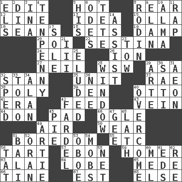 ACROSS 1. Prepare for publication 5. Being at a high temperature 8. Bring up, as a child 12. Actor's bit 13. The content of cognition 15. Water jar 16. Actors Connery and Penn 18. Puts into a specified state 19. Moist 20. Luau course 22. French poetic form 24. Writer Wiesel 26. Electrically charged atom 27. Famous astronaut Armstrong 28. Compass dir. 29. White ___ sheet 32. Comedian Laurel of Laurel & Hardy 35. A single undivided whole 37. Actress Charlotte 38. More than one (prefix) 39. Lair 40. Von Bismarck 41. Epoch 42. Nourish 43. Distinctive style or manner 44. Spanish title 45. Writing tablet 46. Stare at amorously 49. Atmosphere 50. Erode 51. Mood resulting from idleness 55. And so on (abbr.) 56. Small pie 57. Inky black, to poets 59. Home run 63. Jai ____ 64. Ear part 65. Ancient Persian 66. Prong on a fork 67. Eastern Standard Time (abbr.) 68. Otherwise DOWN 1. Raised railways 2. Pass on 3. _ tizzy (2 wds.) 4. 3-inch nail 5. Part of HMS, perhaps 6. Lyric poems 7. False hair 8. "The Thinker" sculptor 9. Enthusiasm 10. _ mater 11. Reproach for some lapse or misdeed 14. Aid 17. Flatfish 21. One more than two 23. Pull behind 25. Evaded 28. Light entry point 29. Johnson of "Laugh-In" 30. Suttee (variant) 31. A really long time 32. Drove too fast 33. "Corrida" creature 34. Actor Alda or Thicke 36. Born 40. Conquer 42. Burden 45. Sliced dessert 47. Turn to the right 48. Thin strip of wood or metal 49. Nick name for Arthur 51. Indonesian resort city 52. NW Algerian seaport 53. Mitch Miller's instrument 54. Crowds into 56. Make lace 58. Fish or hair follower 60. Cartoonist voice _ Blanc 61. Begley and Asner 62. To riddle