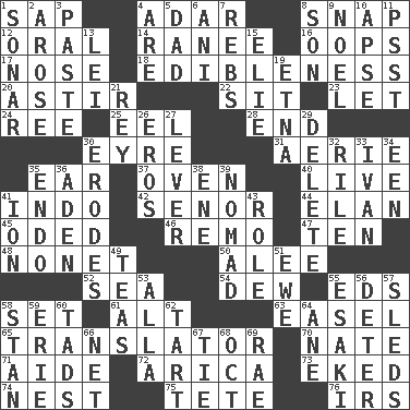 ACROSS 1. Plant excrement 4. The sixth month of the Jewish calendar 8. Fastener 12. Relating to the mouth 14. Indian princess (variant) 16. I made a mistake 17. Sense of smell 18. The property of being fit to eat 20. Having gotten out of bed 22. Be seated 23. Allow 24. To separate or throw off 25. Snakelike fish 28. Conclude 30. Jane of fiction 31. Nest on high 35. Hearing organ 37. Baking chamber 40. Moving, as bait 41. _ china 42. Sir (Sp.) 44. Enthusiasm 45. Wrote a lyric poem 46. San ____ (Riviera town) 47. "___ Little Indians" 48. Music written for nine 50. Toward shelter 52. Ocean 54. Morning condensation 55. Begley and Asner 58. Put into a specified state 61. The first octave above the treble staff 63. Artist's stand 65. Interpreter 70. Nathan's nickname 71. Helper 72. N. Chile seaport 73. Supplemented with great effort 74. Egg locale 75. False hair 76. Big collection agency DOWN 1. Underwater navigation system 2. Came up 3. Thick mixture 4. "We ___ not amused" (Victoria) 5. Male parent 6. Cuckoo 7. Confederate soldiers (slang) 8. Boy, to dad 9. Christmas carol 10. Domed church section 11. Inconspicuous attention getter 13. Luau accessory 15. Writer Wiesel 19. Inactive volcano in Sicily 21. Marina Del _, California 26. Greek god of love 27. Prying instrument 29. Erase 30. Eats (away) 32. Cause heat under the collar 33. _ the terrible 34. Car or cant ending 35. Inside; within (prefix) 36. An important port of Yemen 38. Compass dir. 39. Roamer 41. Electrically charged atom 43. Hero or heavy, e.g. 49. Beverages made from leaves 51. She-sheep 53. Silent film actress Nazimova 55. 1973 Nobel Price Winner (Physics) Leo 56. Prevent from occurring 57. Bobsleighs 58. Comedian Laurel of Laurel & Hardy 59. One of the Great Lakes 60. Small amounts or degrees 62. Small pie 64. One (Scot) 66. Remaining after all deductions 67. Standoff 68. Sep. follower 69. Actress Charlotte