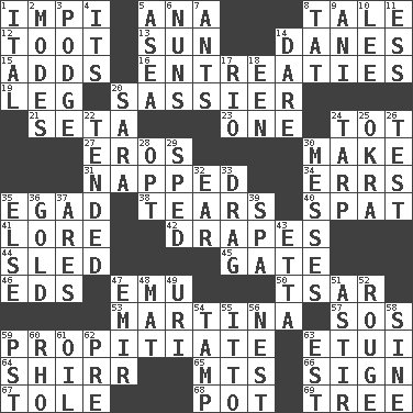 ACROSS 1. Body of Kaffir warriors 5. Santa ___, CA 8. Falsehood 12. A blast of a horn 13. Player for Phoenix 14. Natives or inhabitants of Denmark 15. Sums up 16. Pleas 19. Part of a journey 20. More disrespectful 21. Bristle 23. Single 24. Small child 27. Greek god of love 30. Cause to be 31. Slept 34. Blunders 35. Mild oath 38. Lacerates 40. Argument over a trivial matter 41. Old wives' tales, e.g. 42. Window treatments 44. Downhill vehicle 45. Yard entry 46. Begley and Asner 47. Australian flightless bird 50. Russian ruler of old 53. Chrissie's court nemesis 57. Mayday 59. Appease 63. Needle case 64. Bake eggs in their shells 65. Mountains (abbr.) 66. Omen 67. Lacquered or enameled metalware 68. Cooking vessel 69. Relationship diagram DOWN 1. Slanted text style (abbr.) 2. Methods 3. Porridge 4. ___ a Wonderful Life 5. Toward the sea 6. Religious women 7. Pismires 8. Make lace 9. Black tropical American cuckoo 10. Area sheltered from the wind 11. Curvy letter 14. Have the gumption 17. River (Sp.) 18. Car or cant ending 20. "Two Mules for Sister ____" 22. Looked after 24. Canvas cover 25. Gumbo ingredient 26. Trial 28. Elect 29. Broke a traffic law 30. Makes clutter 32. Hearing organ 33. To be drawn or hauled along 35. Otherwise 36. Precious metal 37. Ancient Greek god of war 39. Health resort 43. Singer James 47. Arab leader 48. Floor covering 49. RI univ. 51. Having gotten out of bed 52. Makeup applied to the cheeks 54. Pack (down) 55. "Tell ____ the Marines!" 56. Egg locale 58. Trig term 59. Pacific Standard Time (abbr.) 60. 17th letter of the Greek alphabet 61. Lubricate 62. Before (prefix) 63. Eastern Standard Time (abbr.)