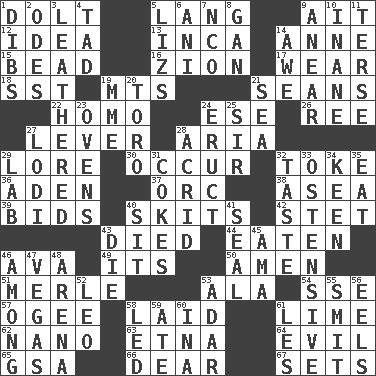 ACROSS 1. Stupid person 5. Austrian-born American filmmaker Fritz 9. Small island 12. The content of cognition 13. South American Indian 14. Singer Murray 15. Necklace unit 16. The Jewish people; Israel 17. Put on (as clothing) 18. Fast jet (abbr.) 19. Mountains (abbr.) 21. Actors Connery and Penn 22. Same (prefix) 24. Compass dir. 26. To riddle 27. Prying instrument 28. Operatic vocal solo 29. Old wives' tales, e.g. 30. Happen 32. Puff or smoke 36. An important port of Yemen 37. The grampus (Milton) 38. Toward the sea 39. Auction offers 40. Burlesque acts 42. Proofreading order 43. Passed on 44. Consumed 46. Actress Gardner 49. It is 50. So be it 51. Haggard of country music 53. According to 54. Compass dir. 57. Double curve, resembling the letter S 58. Put down 61. Citrus frut 62. Billionth: prefix 63. Inactive volcano in Sicily 64. Tending to cause great harm 65. Girls' org. (abbr.) 66. Letter starter 67. Puts into a specified state DOWN 1. Rights 2. Lyric poems 3. Tough but pliablecoriaceous 4. Small amount or degree 5. Belonging to Elizabeth 6. Black tropical American cuckoo 7. Non-commissioned officer (abbr.) 8. Separate the seeds from cotton 9. Approach 10. Silly 11. Laconic 14. Deep reverence 19. Madame (abbr.) 20. "Corrida" creature 21. Ocean 23. Baking chambers 24. Spew [out] 25. Title for a knight 27. Farming town in central California 28. Bitter 29. Experiment locale 31. Popular sodas 32. Clothes sense 33. Clearly or manifestly demonstrative 34. Peachy ____! 35. Ingest 40. Be seated 41. Lick closed 43. Expire 45. Nursemaid (var.) 46. Amid 47. Viva Las _ 48. Sports stadium 52. Lion 53. The sixth month of the Jewish calendar 55. Stricken, poetically 56. Snakelike fish 58. Directed 59. Had dinner 60. _ tizzy (2 wds.) 61. French article