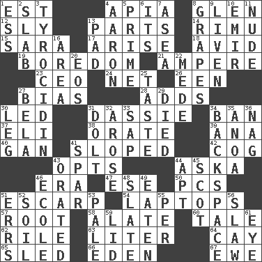 ACROSS 1. Eastern Standard Time (abbr.) 4. Capital of Western Samoa 8. Small, secluded valley 12. Roguish 13. Pieces 14. Tall New Zealand timber tree 15. "Two Mules for Sister ____" 17. Ascend 18. Enthusiastic 19. Mood resulting from idleness 21. Electrical Unit 23. Corporate head (abbr.) 24. Fish or hair follower 26. Car or cant ending 27. Prejudice 28. Sums up 30. Directed 31. Hyrax 34. Prohibit 37. Biblical high priest 38. Declaim 39. Santa ___, CA 40. Separate the seeds from cotton 41. Had an oblique or slanted direction 42. Gear tooth 43. Chooses 44. "____ silly question..." 46. Period 47. Compass dir. 50. Personal Computers (abbr.) 51. Fortification 54. Portable computers 57. Carrot, for example 58. Having winglike extensions 60. Falsehood 62. Cause heat under the collar 63. 61 cubic inches 64. Island 65. Downhill vehicle 66. Genesis locale 67. She-sheep DOWN 1. Curvy letter 2. Thick slice 3. Polypeptide antibiotic 4. Composer Copland 5. A-one 6. It is 7. At sea 8. Raisin fruits 9. Make or become more lively 10. Arab leader 11. Naked 13. Writing tablet 16. Type of rug 20. Greek goddess of the dawn 22. Ancient Persian 25. Clothes sense 27. Actor Lugosi 29. Passed on 30. Part of a journey 31. Stupid person 32. Came up 33. Plant excrement 34. Keyboard key 35. Small Philippine buffalo 36. Tired old horse 41. Coast Guard woman 43. Spoke pompously 44. Fitting 45. Native of Scotland 46. Learning spot: Fr. 48. Schedule 49. Consumed 51. Blunders 52. Earth 53. Light colored 55. For each 56. Cole _ (cabbage dish) 59. Flaplike covering 61. Sight organ