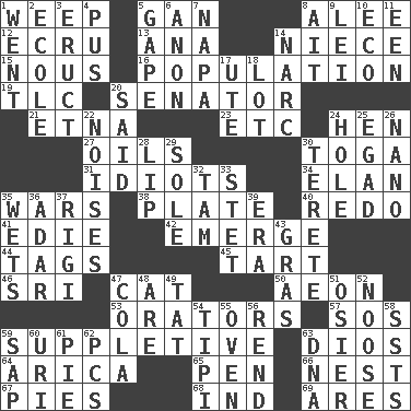 ACROSS 1. Shed a tear 5. Separate the seeds from cotton 8. Toward shelter 12. Shade of tan 13. Santa ___, CA 14. Sibling's daughter 15. Horse sense 16. Census information 19. Affectionate concern, for short 20. Elected representative 21. Inactive volcano in Sicily 23. And so on (abbr.) 24. Layer 27. Lubricates 30. Ancient Roman robe 31. Foolish or stupid persons 34. Flair 35. Armed conflicts 38. Food holder 40. Make new 41. Singer Brickell 42. Develop 44. Labels 45. Small pie 46. Indian title of respect (Mr.) 47. Domesticated feline 50. A really long time 53. Speakers 57. Mayday 59. Supplementary 63. "Vaya con ____" 64. N. Chile seaport 65. Animal enclosure 66. A home for chicks 67. Sliced desserts 68. Indiana (abbr.) 69. Ancient Greek god of war DOWN 1. Gone 2. Learning spot: Fr. 3. Spew [out] 4. Fluid product of inflammation 5. Stare wonderingly 6. Soon (poet.) 7. California wine valley 8. Small island 9. Flowery wreath 10. Environmental prefix 11. Car or cant ending 14. Drug cop 17. Shoshoni 18. Car dealer's back yard 20. Stated 22. Annoying sounds 24. Hollow 25. Mild oath 26. Billionth: prefix 28. Mouth edge 29. Not divided or shared with others 30. Cylindrical with tapered ends 32. Scottish cap 33. Proofreading order 35. Moistens 36. The sixth month of the Jewish calendar 37. Swiss mountan, "Queen of the Mountains" 39. Period 43. Pate de foie ____ 47. Root beer relative 48. "We ___ not amused" (Victoria) 49. Make lace 51. Flexible twig of a willow tree 52. Trap for birds or small mammals 54. Native american tent (variation) 55. Baking chamber 56. Tear apart 58. Fast planes 59. Plant excrement 60. RI univ. 61. Sliced dessert 62. Personal Computers (abbr.) 63. Heredity factor (abbr.)