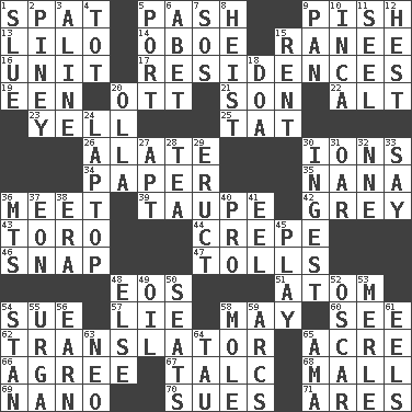 ACROSS 1. Petty quarrel 5. Romantic infatuation 9. Expression of disdain 13. _ and Stitch 14. Mitch Miller's instrument 15. Indian princess (variant) 16. A single undivided whole 17. Homes 19. Car or cant ending 20. Baseball player Mel 21. Manchild 22. The first octave above the treble staff 23. Shout 25. Make lace 26. Having winglike extensions 30. Charged particles 34. Some stationery 35. Grandmother 36. Confront 39. Grayish beige 42. Jennifer or Joel 43. "Corrida" creature 44. Streamer paper 46. Fastener 47. For Whom the Bell _____ 48. Greek goddess of the dawn 51. Smallest unit of an element 54. Institute legal proceedings 57. Whopper 58. Fifth month 60. Observe 62. Interpreter 65. 1/640 square mile 66. Match 67. Baby powder 68. Promenade 69. Billionth: prefix 70. Institutes legal proceedings 71. Ancient Greek god of war DOWN 1. Turn sharply 2. Abounding in pines 3. Place in a line 4. Small child 5. Sweet dark-red dessert wine 6. Collude with 7. Distress signal 8. Robbery 9. Baking dish 10. South American Indian 11. Stitch closed the eyes of (a falcon) 12. Behest 15. Monthly bill 18. ___ good deed 20. Rounded earthenware pot or jar 24. Portable computer 27. Fitting 28. Beverage made from leaves 29. Spew [out] 30. Swallow 31. Boat paddle 32. Compass dir. 33. Declare 36. Mountains (abbr.) 37. Period of immesurable duration 38. Period 40. Adept person 41. Snakelike fish 45. Shaw product 48. Otherwise 49. Petroleum 50. Theater features 52. Witty Wilde 53. Haggard of country music 54. Comedian Laurel of Laurel & Hardy 55. Capital and largest city of Mongolia 56. Merit 58. Undercover agent 59. Arches 61. Snakelike fish 63. Modern: prefix 64. The 19th letter of the Greek alphabet 65. Nursemaid (var.)