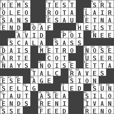 ACROSS 1. Equivocates 5. Trial 9. _ Lanka 12. Butter sub 13. Round or rotation of duties 14. Den 15. Without 16. He sold his birthright 17. Inactive volcano in Sicily 18. Conclusion 19. Clumsy lout 21. Robbery 22. Enthusiastic 24. Luau course 26. Born 27. Any of the three canals of the cochlea 28. Backtalk 29. Raised platform 30. Paris' subway 32. Characteristic smell of wine 36. Johnson of "Laugh-In" 37. Small bed 38. One who makes use of a thing 39. Negative votes 40. Annoying sound 42. Singer James 43. Baby powder 44. All-night dance parties 46. Compass dir. 49. Personal question 50. The Jewish people; Israel 51. Major League Baseball Commissioner Bud 53. Directed 54. Player for Phoenix 57. Tense 58. Toward the sea 61. Grain storage tower 62. Conclusions 63. Painter Guido (1575-1642) 64. _ the terrible 65. Compass dir. 66. Nourish 67. Western Nevada city DOWN 1. Stockings 2. Flair 3. Ananias' fault 4. Distress signal 5. Not kosher 6. Greek goddess of the dawn 7. R.R. building 8. The 19th letter of the Greek alphabet 9. Smooth fabric 10. Wash lightly 11. Feeling or showing extreme anger 14. Area sheltered from the wind 19. Lubricate 20. First man 21. Part of HMS, perhaps 23. Flower holders 24. Pieces 25. Bear (Spanish) 27. "Two Mules for Sister ____" 28. Unemotional 29. One of the 12 tribes of Israel 31. Learning spot: Fr. 32. New (sp.) 33. Clearly or manifestly demonstrative 34. Puts into a specified state 35. Period 40. Tired old horse 41. Celtic language 43. Label 45. Assist 46. _____ Park, CO 47. Actors Connery and Penn 48. Evade 52. It is 53. Put down 55. ____ Bator, Mongolia 56. Words to Nanette 58. Sandy's bark 59. Perceive with the eye 60. Compass dir. 61. Title for a knight