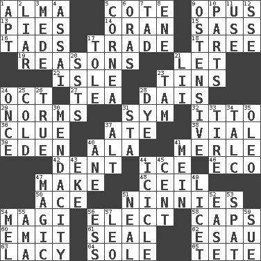 ACROSS 1. _ mater 5. ____ d'Azur (French Riviera) 9. Musical composition 13. Sliced desserts 14. Northwest Algerian city 15. Backtalk 16. Small boys 17. Buy and sell 18. Woody plant 19. Thinks logically 21. Allow 22. Capri or Wight 23. Airtight sealed metal containers 24. Sep. follower 27. Afternoon social gathering 28. Raised platform 29. Typical standards 31. Symbol (abbr.) 32. "Tell ____ the Marines!" 36. A slight indication 37. Had dinner 38. Small bottle 39. Paradise 40. According to 41. Haggard of country music 42. Gouge 44. Frozen water 46. Environmental prefix 47. Cause to be 48. To provide with a ceiling 50. Adept person 51. Fools 54. Wise men 56. Choose 58. Smile enhancers 60. Send forth 61. Lick closed 62. Son of Isaac 63. Made of lace 64. Flatfish 65. Wig DOWN 1. Fitting 2. One who doesn't tell the truth 3. Ancient Persian 4. Slender Brazilian palm 5. Pupil covering 6. Mouths or openings 7. Small amount or degree 8. Compass dir. 9. Clearly or manifestly demonstrative 10. Components 11. Purpose 12. Compass dir. 17. Lacquered or enameled metalware 20. Fast planes 21. Cards in a Roman deck? 23. Scottish cap 24. Single time 25. Having a low temperature 26. Loyal 28. Color 30. Ananias' fault 31. R.R. building 33. Hoop that covers a wheel 34. Baby powder 35. Butter sub 37. The first octave above the treble staff 40. A saturated hydrocarbon 41. Count _ (2 wds.) 43. Make supply last 44. Ice on the eave 45. Penny 47. Mysterious quality of enchantment 49. It is permitted: Lat. 51. Be tempered by heat 52. Comfort 53. Argument over a trivial matter 54. Cartoonist voice _ Blanc 55. Housemaid (var.) 56. Curvy letter 57. Lion 59. Institute legal proceedings