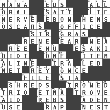 ACROSS 1. Nanny 5. Begley and Asner 8. 100% 11. Spoken 12. Suttee (variant) 14. Falsehood 15. Impudent aggressiveness 17. Inky black, to poets 18. Coop moms 19. Motion picture awards 21. Position of authority 23. Title for a knight 25. Pate de foie ____ 26. French philosopher Descartes 27. Ewer handle 28. Teachers' org. 31. To riddle 33. Australian flightless bird 35. 1973 Nobel Price Winner (Physics) Leo 37. "You Light Up My Life" star Conn 38. Single 40. A whole individual unit 41. Place in a line 43. Retirement account (abbr.) 45. Directed 46. Fish or hair follower 47. Marina Del _, California 50. Single time 52. Do some clerical work 53. R.R. building 54. Tears up 56. Pressed 61. Musical group of three 62. Inactive volcano in Sicily 65. Collection of objects 66. Help 67. Confederate soldiers (slang) 68. An important port of Yemen 69. Purpose 70. Hit sharply and swiftly 71. Egg locale DOWN 1. Words to Nanette 2. Ancient Greek god of war 3. Drug cop 4. Inventor's middle name 5. Compass dir. 6. Apply (a substance) by light strokes 7. Moe Howard, for one 8. Actor Baldwin 9. Actor's bit 10. French article 13. Kind of red light 16. Celtic language 18. Part of HMS, perhaps 20. Trig term 22. Conductor's collection 24. San ____ (Riviera town) 26. It's straight from the horse's mouth 28. Nathan's nickname 29. Made supply last 30. Direct toward a target or goal 31. Cause heat under the collar 32. Prepare for publication 34. Single; one (prefix) 36. Filth; sediment 37. One of the 12 tribes of Israel 39. Greek god of love 42. One of the Great Lakes 44. Against 48. A person who is older than you are 49. Last 51. Haul 52. Back 54. Indian titles of respect 55. Flintstone garb 57. NW Algerian seaport 58. Connecting point 59. Nights before holidays 60. Undesirable depression on a surface 61. The 19th letter of the Greek alphabet 63. Basketball assoc. 64. Viper