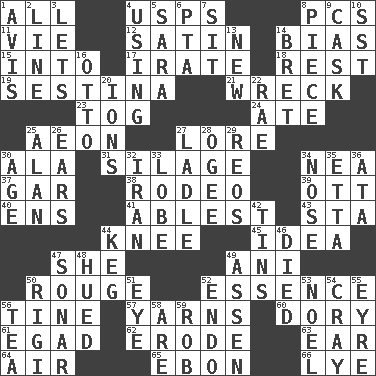 ACROSS 1. 100% 4. United States Postal Service (abbr.) 8. Personal Computers (abbr.) 11. Compete 12. Smooth fabric 14. Prejudice 15. To the inside or interior of 17. Feeling or showing extreme anger 18. Respite 19. French poetic form 21. Raze 23. Coat; cloak 24. Had dinner 25. Period of immesurable duration 27. Old wives' tales, e.g. 30. In the manner of 31. Fodder prepared in a silo 34. Teachers' org. 37. Slender fish 38. Cowboy competition 39. Baseball player Mel 40. Followers of ems 41. Most capable 43. R.R. building 44. Leg joint 45. The content of cognition 47. A female animal or person 49. Cuckoo 50. Makeup applied to the cheeks 52. Substance 56. Prong on a fork 57. Tall tales 60. Dinghy 61. Mild oath 62. Eat (away) 63. Ewer handle 64. Wind 65. Inky black, to poets 66. Potassium hydroxide DOWN 1. Deliberation 2. Actor's bit 3. Allows 4. Exploiting 5. "Two Mules for Sister ____" 6. Parent Teacher Assoc. 7. Be seated 8. Part 9. Keg 10. Fast jet (abbr.) 13. ___ Haven, CT 14. Cy Young winner Saberhagen 16. "Beetle Bailey" pooch 20. Charged atoms 22. Actress Charlotte 25. Actor Alda or Thicke 26. Hearing organs 27. Dipping utensil 28. Double curve, resembling the letter S 29. Vintage cars 30. Mature 32. SW Asia republic 33. Ear part 34. Olfactory organ 35. Singer James 36. "One Day ___ Time" 42. Airtight sealed metal containers 44. Barrel 46. Passed on 47. Echolocation 48. Took on color 49. NE Netherlands city 50. Swiss mountan, "Queen of the Mountains" 51. Sight organ 52. Inside; within (prefix) 53. Christmas carol 54. Supercomputer manufacturer 55. Jane of fiction 56. Afternoon social gathering 58. "We ___ not amused" (Victoria) 59. Director Reiner