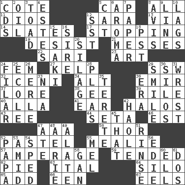 ACROSS 1. ____ d'Azur (French Riviera) 5. Head covering 8. 100% 11. "Vaya con ____" 12. "Two Mules for Sister ____" 13. By way of 14. Chalkboards 17. Ceasing 19. Stop 21. Makes clutter 22. Indian skirt 23. Tate display 24. Opposite of masc. 27. Seaweed 29. Compass dir. 32. Ancient Celtic tribe of eastern Britain 34. Keyboard modifier key 36. Arab leader 37. Old wives' tales, e.g. 38. Turn to the right 39. Cause heat under the collar 40. Silent film actress Nazimova 41. Hearing organ 42. Radiant circles of light 43. To riddle 44. Bristle 46. Eastern Standard Time (abbr.) 47. American Automobile Association (abbr.) 50. Son of Odin 52. Soft color 55. Ear of corn 57. Electrical Measurement 59. Looked after 62. Sliced dessert 63. Slanted text style (abbr.) 64. Grain storage tower 65. Say or write further 66. Car or cant ending 67. Snakelike fish DOWN 1. Music discs 2. Petroleum 3. Frog relative 4. _____ Park, CO 5. Domesticated feline 6. Odor 7. Some stationery 8. Opinion 9. Actor's bit 10. Falls behind 12. Fast jet (abbr.) 15. 1973 Nobel Price Winner (Physics) Leo 16. Male parent of an animal 18. Pacific Standard Time (abbr.) 20. Fodder prepared in a silo 24. Of or pertaining to a thread or threads 25. Learning spot: Fr. 26. Haggard of country music 28. Entreaties 29. Grin 30. Grain storage towers 31. Take or capture by force 33. Teachers' org. 35. Cylindrical with tapered ends 36. Period 42. White Person, in Hawaii 45. Not this but _ 47. Had dinner 48. Nest on high 49. Having winglike extensions 51. Wash lightly 52. Dad 53. Among 54. Moved rapidly 55. Cartoonist voice _ Blanc 56. Singer Brickell 58. Separate the seeds from cotton 60. Pipe bend 61. Two (Sp.)