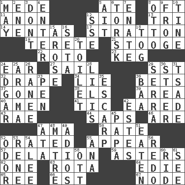 ACROSS 1. Ancient Persian 5. Had dinner 8. Often (poetically) 11. Soon (poet.) 12. The Jewish people; Israel 13. Three (prefix) 14. Gossips 17. Ski resort town in Vermont 19. Cigar-shaped 21. Moe Howard, for one 22. Printing process, for short 23. Barrel 24. Hearing organ 27. Move on water 29. Fast jet (abbr.) 32. Window treatment 34. Untruth 36. Stakes 37. Went 38. Raised railways 39. Type of rug 40. So be it 41. Nervous spasm 42. Having ears or earlike features 43. Actress Charlotte 44. Plant excrements 46. "We ___ not amused" (Victoria) 47. Nanny (var.) 50. Pace 52. Spoke pompously 55. Seem 57. Conveyance 59. Michaelmas daisies 62. Single 63. Round or rotation of duties 64. Singer Brickell 65. To sift 66. Eastern Standard Time (abbr.) 67. Connecting point DOWN 1. Can I? 2. Compass dir. 3. Do not 4. Keyboard key 5. Small island 6. Cod relative 7. Related on the mother's side 8. "Beetle Bailey" pooch 9. Tree-dwelling hopper 10. Prong on a fork 12. Compass dir. 15. Came up 16. Stalk of a moss capsule 18. Coat; cloak 20. Bathroom plumbing fixture 24. _ Allan Poe 25. Scent 26. The wife of a rajah (variant) 28. Ms. Damita and namesakes 29. Spanish missionary in California 30. Bull 31. Sadhe (variant) 33. Writing instrument 35. Fortification 36. Sound made by sheep 42. _____ Park, CO 45. Dad 47. "One Day ___ Time" 48. Distance measurement (Brit.) 49. Goodbye (Sp.) 51. Eroded 52. Scent 53. French philosopher Descartes 54. Toward shelter 55. Santa ___, CA 56. Make new 58. Baseball player Mel 60. To free from 61. Perceive with the eye