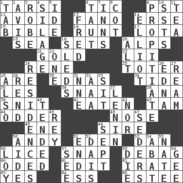 ACROSS 1. Tarsus (plural) 6. Nervous spasm 9. Pacific Standard Time (abbr.) 12. Keep away from 13. Papal veil 14. Celtic language 15. God's Word 16. The smallest animal of a litter 17. Globular water bottle used in Asia 18. Ocean 19. Arranges properly for use 20. High mountains 21. Precious metal 23. Cards in a Roman deck? 24. French philosopher Descartes 25. Carrier 28. "We ___ not amused" (Victoria) 30. Ferber et al. 34. Periodic rise and fall of the sea level 35. French article 36. Slow-paced one 38. Santa ___, CA 39. In a ____ (agitated or irritated) 41. Consumed 43. Scottish cap 44. More peculiar 46. Characteristic smell of wine 48. Compass dir. 49. Father 50. Actor Griffith 51. Genesis locale 53. One of the 12 tribes of Israel 56. Louse (plural) 57. Fastener 58. Debunk (Brit. slang) 60. Wrote a lyric poem 61. Prepare for publication 62. Feeling or showing extreme anger 63. It is so 64. Curvy letter 65. First name in cosmetics DOWN 1. Bar bill 2. Deliberation 3. Loose flowing garment 4. Fodder prepared in a silo 5. Binary compound 6. Drawn tight 7. Lodging establishments 8. Small bed 9. Conciliate 10. Fast planes 11. Afternoon social gathering 13. Flintstone 14. American author Paul (1891-1958) 19. Bobsleighs 20. The first octave above the treble staff 22. Single 24. Dwellings 26. Pulitzer Prize-winning author Ferber 27. 480, 500 or 516 sheets of paper 28. In addition 29. Tear apart 31. Compass dir. 32. American Automobile Association (abbr.) 33. Be seated 37. Soviet premier 1918-24 40. Looked after 42. Not either 45. Marina Del _, California 47. Spring feasts 49. Back-to-school mo. 50. Assistant 51. Conclusions 52. Raised platform 54. Blind as ____ 55. Nathan's nickname 56. Myrna of the movies 57. Perceive with the eye 58. Expire 59. Unit of force equal to gravity