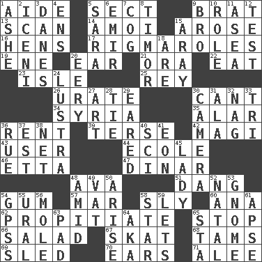 ACROSS 1. Assistant 5. Religious group 9. Naughty child 13. Skim 14. Mine, in Marseilles 15. Came up 16. Coop moms 17. Complicated, petty procedures 19. Compass dir. 20. Ewer handle 21. Mouth or opening 22. Consume 23. Capri or Wight 25. Marina Del _, California 26. A salt of uric acid 30. Patter 34. Damascus' land 35. Having or resembling wings 36. Monthly bill 39. Laconic 42. Wise men 43. One who uses or employs something 44. Learning spot: Fr. 46. Singer James 47. Middle Eastern gold or silver currency 48. Actress Gardner 51. Mild oath, euphamism for damn 54. Chewing product 57. Spoil 58. Mischievous 60. Santa ___, CA 62. Conciliate 65. Discontinue 66. Vegetable dish 67. Three-handed card game 68. Scottish caps 69. Downhill vehicle 70. Hearing organs 71. Toward shelter DOWN 1. American tennis player Robert 2. Ancient Celtic tribe of eastern Britain 3. Natives or inhabitants of Denmark 4. Followers of ems 5. "Two Mules for Sister ____" 6. Independent ruler or chieftain 7. Gear tooth 8. The easternmost of the Lesser Sundas 9. Sis' sibling 10. Hero or heavy, e.g. 11. At sea 12. Trial 15. Like ___ of sunshine 18. "We ___ not amused" (Victoria) 20. Suggestive of the supernatural 24. A period of five years 27. Nonscientific branch of learning 28. Standoff 29. Having ears or earlike features 30. Device for capturing images 31. Wing 32. Tired old horse 33. Three (prefix) 36. Sorrow 37. Eastern Standard Time (abbr.) 38. Fish or hair follower 40. _-fi 41. Period of immesurable duration 45. Kenny Rogers chart-topper in '80 48. Among 49. Large container 50. Originate 52. Relating to or accompanying birth 53. Dwarf 54. Global Positioning Systems (abbr.) 55. Mountain range 56. Undercover agent 58. Play the lead 59. Allows 61. Domed church section 63. Groovy apt. 64. Alias (abbr.) 65. R.R. building