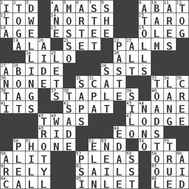 ACROSS 1. It would 4. Collect or gather 9. Blind as ____ 13. Pull behind 14. _ pole 15. Edible starchy tuberous root 16. Personal question 17. First name in cosmetics 18. Cassini of fashion 19. In the manner of 21. Put into a specified state 22. Insides of hands 24. _ and Stitch 26. Everything 27. Tolerate 29. Fast planes 30. Music written for nine 31. Go away! 33. Affectionate concern, for short 36. Label 37. Paper fasteners 40. Rowing implement 41. ___ a Wonderful Life 42. Petty quarrel 43. Empty; void 45. It was, poetically 47. Cabin 48. To free from 49. Immeasurably long periods of time 50. Give a jingle 52. Conclusion 54. Baseball player Mel 56. Came down and settled, as after flight 57. Entreaties 59. Mouth or opening 61. Depend 62. Moves on water 63. Fr. "Yes" 64. Give a ring to 65. An arm off of a larger body of water 66. Directed DOWN 1. Call ___ day 2. Ancient Roman robe 3. Homes 4. One (Scot) 5. With motion or animation 6. Johnson of "Laugh-In" 7. Proofreading order 8. A female animal or person 9. Ringlike coral islands and reefs 10. Lip ointment 11. Ancient Greek god of war 12. Coat; cloak 20. Helper 22. Thick mixture 23. The first octave above the treble staff 25. Allows 27. Against 28. Water vessel 29. Table seasoning 31. Plant excrements 32. Tax preparer (abbr.) 33. Inedible or poisonous agaric 34. Long (Scottish) 35. Algonquian 38. Sadhe (variant) 39. Grain storage tower 44. Words to Nanette 45. Trinitrotoluene 46. Acquire through effort 49. Peak District village in England 50. Entreaty 51. Land elevation 52. Style 53. Famous astronaut Armstrong 55. Loyal 56. Curve 57. 23rd letter of the Greek alphabet 58. Fast jet (abbr.) 60. Assist