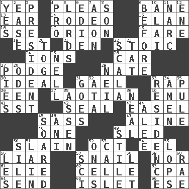 ACROSS 1. Slangy assent 4. Entreaties 9. Object of repulsion 13. Hearing organ 14. Cowboy competition 15. Flair 16. Compass dir. 17. Greek mythologigal hunter 18. Conductor's collection 19. Eastern Standard Time (abbr.) 21. Lair 22. Unemotional 24. Charged particles 26. 4-wheeled motor vehicle 27. Porridge 29. Nathan's nickname 30. Perfect 31. Highlander 33. Strike 36. Car or cant ending 37. Of or relating to Laos or its people 40. Australian flightless bird 41. Fast jet (abbr.) 42. Lick closed 43. Artist's stand 45. Backtalk 47. Place in a line 48. Single 49. Downhill vehicle 50. Killed 52. Sep. follower 54. Snakelike fish 56. One who doesn't tell the truth 57. Slow-paced one 59. And not 61. Writer Wiesel 62. Cell (Danish) 63. Numbers guy (abbr.) 64. Post 65. Small island 66. Compass dir. DOWN 1. Consenting reply 2. Comfort 3. Elected leader of a country 4. Adept person 5. Titled peers of a realm 6. Singer Brickell 7. A really long time 8. Manchild 9. Prior to 10. Jai ____ 11. Drug cop 12. Compass dir. 20. Ancient Roman robe 22. Any of the three canals of the cochlea 23. Make lace 25. 1994 drama film starring Jodie Foster 27. Sliced desserts 28. Lyric poems 29. Famous astronaut Armstrong 31. Travels 32. _ moment's notice (2 wds.) 33. Dwelling 34. So be it 35. Whine 38. NE Netherlands city 39. Be tempered by heat 44. Toward shelter 45. Flew 46. Cuckoo 49. Vertical member of a panel or frame 50. Filth; sediment 51. (Had) reclined 52. Singles 53. Give a ring to 55. Chops off 56. French article 57. _-fi 58. Allow 60. Actress Charlotte