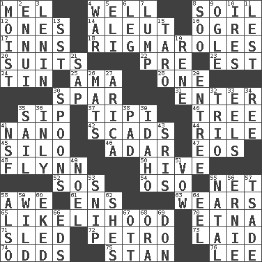 ACROSS 1. Cartoonist voice _ Blanc 4. Water source 8. Earth 12. Washington bills 14. Eskimo relative 16. Legendary monster 17. Lodging establishments 18. Frustrating wastes of time 20. Sets of matching outer garments 22. Before (prefix) 23. Eastern Standard Time (abbr.) 24. Shallow baking pan 25. Nursemaid (var.) 28. Single 30. Coast Guard woman 31. Keyboard key 35. Small drink 37. Native american tent (variation) 40. Woody plant 41. Billionth: prefix 42. Large numbers or amounts 44. Cause heat under the collar 45. Grain storage tower 46. The sixth month of the Jewish calendar 47. Greek goddess of the dawn 48. Film actor Errol 50. Hub of activity 52. Mayday 54. Bear (Spanish) 55. Remaining after all deductions 58. Deep reverence 61. Followers of ems 63. Erodes 65. Probability 70. Inactive volcano in Sicily 71. Downhill vehicle 72. Stone: prefix 73. Put down 74. Probability 75. Comedian Laurel of Laurel & Hardy 76. Area sheltered from the wind DOWN 1. Damp 2. World-weariness 3. Soviet premier 1918-24 4. Armed conflict 5. Connecticut Ivy Leaguer 6. Part of a journey 7. Mass 8. "Barney Miller" actor Jack 9. Stare at amorously 10. Angers 11. For fear that 13. Fast jet (abbr.) 15. Pacific island yam 19. French philosopher Descartes 21. Plant excrement 26. Floor protectors 27. N. Chile seaport 29. Main course 30. Soup utensils 32. Musical group of three 33. Snakelike fish 34. To riddle 35. Travel by water 36. Inwardly 38. Groovy apt. 39. Potato state 41. Science/research agcy. 43. Indian titles of respect 49. Christmas carol 51. Solemn pledge 53. Sever or remove by pinching or nipping 55. Relating to or accompanying birth 56. Bert's buddy 57. Sadhe (variant) 58. In addition 59. Rampant 60. Made supply last 62. "______ My Girl" (Turtles hit) 64. Snakelike fish 66. Begley and Asner 67. Baseball player Mel 68. Mouth or opening 69. Spanish title