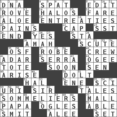 ACROSS 1. Heredity factor (abbr.) 4. Argument over a trivial matter 8. Prepare for publication 12. Be footloose 14. Auras 16. Conductor's collection 17. _ vera 18. Pleas 20. Aches 22. Head covering 23. Fast jet (abbr.) 24. Conclude 25. Affirmative reply 28. R.R. building 30. Housemaid 31. Snake scale 35. Order of Saint Francis (abbr.) 37. Loose flowing garment 40. Group working together 41. The sixth month of the Jewish calendar 42. Spanish missionary in California 44. Double curve, resembling the letter S 45. Carryall 46. Within a short period 47. Elected rep. 48. Ascend 50. Stupid person 52. Actor Linden 54. Compass dir. 55. _-fi 58. RI univ. 61. Title for a knight 63. Stories 65. Wine waiters 70. Shopping center 71. Dad 72. Stares 73. Competent 74. Stricken, poetically 75. Toward shelter 76. Put into a specified state DOWN 1. Window treatment 2. Pitcher Ryan 3. Stay clear from 4. A female animal or person 5. Baking dish 6. The first octave above the treble staff 7. Torque (variant) 8. Newt 9. Raised platform 10. Angers 11. Trial 13. Car or cant ending 15. Oceans 19. Tenement units (abbr.) 21. Symbol (abbr.) 26. Hearing organs 27. Imelda's hoard 29. Buttonhole 30. Anew 32. Goad 33. Adolescent 34. She-sheep 35. Scent 36. Suttee (variant) 38. Sis' sibling 39. Eat (away) 41. _ moment's notice (2 wds.) 43. At once, immediately (arch.) 49. Relaxation 51. Allow 53. _ and Stitch 55. Broad, flat, thick pieces 56. Cell (Danish) 57. Small island 58. United States Postal Service (abbr.) 59. Wander aimlessly 60. Body of Kaffir warriors 62. Port city in Latvia 64. Wet nurse (var.) 66. Floor protector 67. Pipe bend 68. To riddle 69. Compass dir.