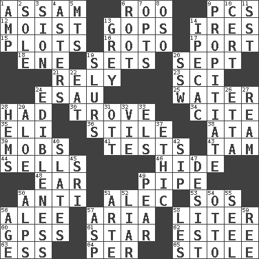 ACROSS 1. Indian state 6. Friend of Pooh 9. Personal Computers (abbr.) 12. Damp 13. Republicans 14. Angers 15. Secret plans 16. Printing process, for short 17. Left side of a ship or aircraft 18. Compass dir. 19. Arranges properly for use 20. Back-to-school mo. 21. Have trust in 23. _-fi 24. He sold his birthright 25. Wetness 28. Possessed 30. Collection of objects 34. Quote 35. Biblical high priest 36. Vertical member of a panel or frame 38. _ moment's notice (2 wds.) 39. Crowds into 41. Trials 43. Scottish cap 44. Exchanges for money 46. Flintstone garb 48. Ewer handle 49. Corncob 50. Opposed to 51. Actor Baldwin 53. Mayday 56. Toward shelter 57. Roberta Peters solo 58. 61 cubic inches 60. Global Positioning Systems (abbr.) 61. Play the lead 62. First name in cosmetics 63. Curvy letter 64. For each 65. Took without asking DOWN 1. Electrical Unit 2. Flatfish 3. The Jewish people; Israel 4. Michaelmas daisies 5. Mountains (abbr.) 6. Carrot, for example 7. Elects 8. Bear (Spanish) 9. Appease 10. Certainty 11. Fast jet (abbr.) 13. Jennifer or Joel 14. Medicinal drug used to evoke vomiting 19. Plays smoothly or legato 20. Compass dir. 22. Consume 24. The property of being fit to eat 26. Singer James 27. 480, 500 or 516 sheets of paper 28. Equivocates 29. Medicinal plant 31. Baseball player Mel 32. Compete 33. Raised railways 37. Moral principle 40. Chalkboards 42. Small drink 45. Indian title of respect (Mr.) 47. Stop 49. Lightbulb-shaped fruit 50. High mountains 51. Johnson of "Laugh-In" 52. One who doesn't tell the truth 54. "Beetle Bailey" pooch 55. Sew up the eyelids of hawks and falcons 56. Ripen 57. Cleo's killer 58. French article 59. To separate or throw off