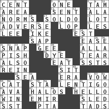 ACROSS 1. Penny 5. Single 8. Scottish cap 11. Length times width 12. Posted 14. Wing 15. Typical models 17. Twentieth part of a lira 18. Car dealer's back yard 19. Contrary to your interests or welfare 21. Trim (branches) 22. French article 23. Area sheltered from the wind 24. Mamie's husband 25. Eastern Standard Time (abbr.) 27. Plant excrement 28. Comfort 31. Fastener 35. Turn to the right 37. Silent film actress Nazimova 38. Expression of disdain 39. Color 41. Lacerate 42. In addition 43. Consume 45. Fast planes 46. It's straight from the horse's mouth 47. Be seated 49. Ocean 51. Period 52. Promise 55. Domesticated feline 57. R.R. building 60. Small, flat, pigmented spot on the skin 62. Actress Gardner 63. Saint headwear 65. Phone greeting 66. Acquire through effort 67. Arab leader 68. Downhill vehicle 69. Fast jet (abbr.) 70. Parent Teacher Assoc. 71. Bits DOWN 1. Lessep's creation 2. Eat (away) 3. Impudent aggressiveness 4. Not wild 5. Bear (Spanish) 6. 1994 drama film starring Jodie Foster 7. Inside; within (prefix) 8. Baron Munchausen's specialties 9. _ vera 10. Floor protectors 13. Drink excessively 16. Indian titles of respect 17. Oozed 20. Heroin 26. Theater features 29. Narrow board 30. Hearing organs 31. Practice fight 32. "Death on the ____" 33. Aide 34. Give a jingle 36. Sight organ 40. Artist's stands 44. Hoop that covers a wheel 48. Hyperbolic tangent 50. American tennis player Robert 52. Country estate 53. Stared 54. Forest 55. Crow sounds 56. Deliberation 58. Pack (down) 59. Set down 61. Trial 64. Mouth or opening
