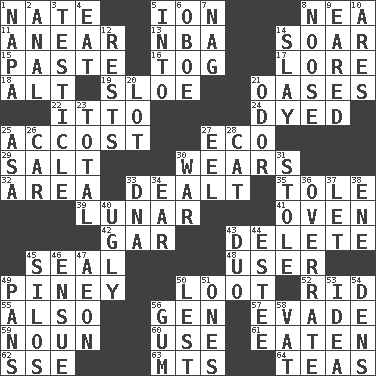 ACROSS 1. Nathan's nickname 5. Electrically charged atom 8. Teachers' org. 11. Approach 13. Basketball assoc. 14. Fly high 15. Thick mixture 16. Coat; cloak 17. Old wives' tales, e.g. 18. The first octave above the treble staff 19. _ gin 21. Fertile tracts in a desert 22. "Tell ____ the Marines!" 24. Colored 25. Buttonhole 27. Environmental prefix 29. Table seasoning 30. Erodes 32. Type of rug 33. Started a card game 35. Lacquered or enameled metalware 39. Type of eclipse 41. Baking chamber 42. Slender fish 43. Erase 45. Lick closed 48. One who uses or employs something 49. Abounding in pines 50. Spoils 52. To free from 55. In addition 56. Commissioned military rank (abbr.) 57. Dodge 59. Part of speech 60. Purpose 61. Ingested 62. Compass dir. 63. Mountains (abbr.) 64. Afternoon social gatherings DOWN 1. California wine valley 2. Of or related to the anus 3. One of the two male reproductive glands 4. Consume 5. To the inside or interior of 6. Mitch Miller's instrument 7. Tired old horse 8. Trap for birds or small mammals 9. Having ears or earlike features 10. Ancient Greek god of war 12. Musical pauses 14. Kill 20. Car dealer's back yard 21. Scent 23. Add up to 25. White ___ sheet 26. Automobile 27. Snakelike fish 28. Feline 30. Armed conflict 31. Took without asking 33. Heredity factor (abbr.) 34. Hearing organ 36. Make much ado about nothing 37. Allow 38. Compass dir. 40. Unsightly 43. Superhero pair 44. First name in cosmetics 45. Grain storage towers 46. Follow as a consequence or result 47. A really long time 49. Zero-star reviews 50. For fear that 51. Singles 53. The main thing one is thinking about 54. Cub Scout units 56. Chewing product 58. Large container