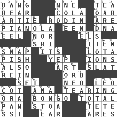 ACROSS 1. Mild oath, euphamism for damn 5. Compass dir. 8. Beverage made from leaves 11. Stern 12. Root beer relative 14. Boat paddle 15. Nick name for Arthur 17. "The Thinker" sculptor 18. "We ___ not amused" (Victoria) 19. Player piano 21. Car or cant ending 22. Heredity factor (abbr.) 23. Snakelike fish 24. Not either 25. Raised railways 27. _ Lanka 28. A whole individual unit 31. Fastener 35. ___ a Wonderful Life 37. Globular water bottle used in Asia 38. Expression of disdain 39. Slangy assent 41. Charged particles 42. In addition 43. Tate display 45. Narrow board 46. It's straight from the horse's mouth 47. Globe 49. Arrange properly for use 51. Modern: prefix 52. Lion 55. Small bed 57. Santa ___, CA 60. Pulling apart 62. Mouth or opening 63. Beat drum 65. Add up to 66. Baking dish 67. Portico 68. False hair 69. Fast jet (abbr.) 70. Ewer handle 71. Ancient Greek god of war DOWN 1. Window treatment 2. Nest on high 3. Brizilian seaport 4. Amused look 5. Non-commissioned officer (abbr.) 6. Thickened enlargement 7. Writer Wiesel 8. Inedible or poisonous agaric 9. Merit 10. Length times width 13. Singer Murray 16. Immeasurably long periods of time 17. Noteworthy scarcity 20. Australian parrot (variant) 26. Ms. Damita and namesakes 29. Inactive volcano in Sicily 30. Vertical spar for supporting sails 31. Coast Guard woman 32. Mediterranean tributary 33. Aide 34. Give a jingle 36. Ocean 40. Right away 44. Family _ (genealogy) 48. Water vessel 50. Bar bills 52. 61 cubic inches 53. Related on the mother's side 54. Stares at amorously 55. 911 reaches them 56. Mouths or openings 58. Make mention of 59. Small Philippine buffalo 61. Round or rotation of duties 64. Slender fish