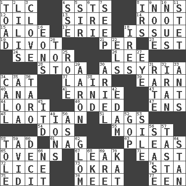ACROSS 1. Affectionate concern, for short 4. Fast planes 8. Lodging establishments 12. Lubricate 13. Beget 14. Carrot, for example 15. _ vera 17. One of the Great Lakes 18. Come out of 19. A piece of turf (Scot.) 21. For each 23. Eastern Standard Time (abbr.) 24. Sir (Sp.) 26. Area sheltered from the wind 28. Portico 30. Nineveh was its capital 34. Feline 37. Den 39. Merit 40. Santa ___, CA 41. Bert's buddy 43. Make lace 44. Australian parrot (variant) 46. Wrote a lyric poem 47. Followers of ems 48. Of or relating to Laos or its people 51. Fails to keep up a pace 54. Two (Sp.) 55. Wet 58. Small amount or degree 61. Tired old horse 63. Entreaties 65. Baking chambers 67. Path through which fluid escapes 71. 90 degrees 72. Louse (plural) 73. Gumbo ingredient 74. R.R. building 75. Prepare for publication 76. Rendezvous 77. Car or cant ending DOWN 1. Frog relative 2. Ms. Damita and namesakes 3. Garlic unit 4. Compass dir. 5. Title for a knight 6. Three (prefix) 7. Ooze 8. Big collection agency 9. Sense of smell 10. Horse sense 11. Proofreading order 16. Immeasurably long periods of time 18. Angers 20. Small child 22. Raised railways 25. Hero or heavy, e.g. 27. Sight organ 29. Composer Copland 30. Satellite of Uranus 31. Pace 32. SW Asia republic 33. Pismires 34. Give a ring to 35. Small Philippine buffalo 36. Edible starchy tuberous root 38. Working for oneself (abbr.) 42. Dutch treat 45. It would 49. Charged atoms 50. White ___ sheet 52. Grand Old Party 53. Filth; sediment 56. Gospel singer Marvin 57. Clothes sense 58. Lacquered or enameled metalware 59. Enthusiastic 60. Tenth: prefix 62. Take by theft 64. Comedian Laurel of Laurel & Hardy 66. Remaining after all deductions 68. Make supply last 69. "We ___ not amused" (Victoria) 70. Krazy ___ of comics