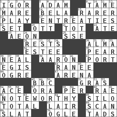 ACROSS 1. Russian composer Stravinsky 5. First of billions? 9. Docile 13. Female horse 14. Actor Lugosi 15. More valued for its uncommonness 16. Live dramatic performance 17. Pleas 19. Arrange properly for use 20. Baseball player Mel 21. Small child 22. Had dinner 23. Period of immesurable duration 25. Compass dir. 26. Musical pauses 30. _ mater 34. First name in cosmetics 35. Lightbulb-shaped fruit 36. Anneal 39. Composer Copland 42. Left side of a ship or aircraft 43. The front part of a cuirass 44. The wife of a rajah (variant) 46. Legendary monster 47. Sports stadium 48. English channel? 51. Pate de foie ____ 54. Adept person 57. Mouth or opening 58. For each 60. Actress Charlotte 62. Music shop? 65. Grain storage tower 66. Add up to 67. Den 68. Examine hastily 69. Narrow board 70. Stare at amorously 71. Bits DOWN 1. Naughty children 2. An organ shaped like a helmet 3. Declaim 4. Marina Del _, California 5. Collude with 6. Gouge 7. The first octave above the treble staff 8. Shops 9. Make lace 10. Roberta Peters solo 11. Confront 12. Celtic language 15. Assign a rank or rating to 18. Greek goddess of the dawn 20. Washington bills 24. Threatening words 27. R.R. building 28. Afternoon social gathering 29. Spanish missionary in California 30. Become visible 31. Lion 32. Spoil 33. Nonscientific branch of learning 36. Modern: prefix 37. Ovum 38. Wind 40. Rowing implement 41. Compass dir. 45. Engineer (abbr.) 48. Soup holder 49. Sis' sibling 50. Monte _, Las Vegas Hotel/Casino 52. N. Chile seaport 53. First course 54. Pismires 55. Calm and collected 56. Singer James 58. Silvers or Donahue 59. Jane of fiction 61. Immeasurably long periods of time 63. Erode 64. Label 65. Fast jet (abbr.)