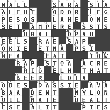 ACROSS 1. Promenade 5. "Two Mules for Sister ____" 9. R.R. building 12. Native American of Southwest Alaska 14. Scent 15. Part of a journey 16. Mexican monetary units 17. Unable to walk 18. Single 19. Put into a specified state 20. Electrical Unit 23. Fast planes 24. Mountain range 25. Brightly colored fish 27. Snakelike fish 30. Actress Charlotte 32. Plant excrement 33. Migrant worker of the '30s 34. Inactive volcano in Sicily 36. Air pressure measure (abbr.) 38. Teachers' org. 39. Consume 40. Pull behind 43. Reproach for some lapse or misdeed 46. Portico 48. Measure of real estate 49. _ de Janeiro 51. Shade tree 52. Not this but _ 53. Fermented drink made from hops 54. Globular water bottle used in Asia 56. Lyric poems 58. Hyrax 61. Actress Gardner 64. Sound made by sheep 65. Undesirable depression on a surface 66. High-strength synthetic material 68. Lubricate 69. Nathan's nickname 70. Started a card game 71. Compass dir. 72. Came down and settled, as after flight 73. Sliced desserts DOWN 1. Atlas contents 2. Toward shelter 3. For fear that 4. Nilotic language 5. Flatfish 6. The sixth month of the Jewish calendar 7. Lover boys 8. "We ___ not amused" (Victoria) 9. Agitate, as a liquid 10. Portable shelter 11. Grows older 13. Russian ruler of old 21. Female horse 22. Food holders 23. Plant excrements 24. Purpose 26. Infant food 27. A really long time 28. Supplement with great effort 29. One who doesn't tell the truth 31. Maternal 35. Ringlike coral islands and reefs 37. Hankering 41. Mouth or opening 42. Soggy 44. Ancient Greek god of war 45. Sliced dessert 47. Mine, in Marseilles 48. _ moment's notice (2 wds.) 50. Severe or trying experience 53. Memphis, Tenn. Street 55. Be inclined (to) 56. Mitch Miller's instrument 57. Raised platform 59. Opposed to 60. Proofreading order 61. Jai ____ 62. Grand slam 63. Pismires 65. Heredity factor (abbr.) 67. Slangy assent