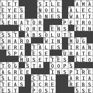 ACROSS 1. Allow 4. Filth; sediment 8. Wet nurse (var.) 11. Sight organs 13. Christmas carol 14. Actor Baldwin 15. Woody plant 16. Washington bills 17. Electrical Unit 18. Legislator 21. Stone: prefix 22. Old wives' tales, e.g. 23. Followers of ems 25. Car or cant ending 26. Fast jet (abbr.) 29. Utter; complete 32. Broken piece 34. Victory 35. Java container 38. We are 39. Falsehoods 41. SW Asia republic 43. Health resort 44. Compass dir. 45. A salt of uric acid 46. French bagpipes 50. Lion 51. Coat; cloak 54. R.R. building 55. I made a mistake 57. Match 59. Stimulate to action 63. Downhill vehicle 64. To provide with a ceiling 67. Operatic vocal solo 68. Afternoon social gatherings 69. 43,560 square feet 70. Confederate soldiers (slang) 71. Eastern Standard Time (abbr.) 72. Mail 73. Compass dir. DOWN 1. Allows 2. Jane of fiction 3. Adolescent 4. Sounds asleep 5. Electrically charged atom 6. Area sheltered from the wind 7. Raised railways 8. Having winglike extensions 9. Distance measurement (Brit.) 10. NE Massachussets city 12. Lick closed 14. Deep reverence 19. Frog relative 20. Globe 21. Pacific Standard Time (abbr.) 23. Writer Wiesel 24. Religious women 26. Compass dir. 27. "______ My Girl" (Turtles hit) 28. Canvas cover 30. A small or young owl 31. Arab leader 33. 480, 500 or 516 sheets of paper 36. Mountain range 37. Yard entry 39. Trial 40. At sea 42. Modern: prefix 45. United States Postal Service (abbr.) 47. Purpose 48. Bathroom 49. Period of immesurable duration 51. Clothes sense 52. Stares at amorously 53. Relatively large 56. Coast Guard woman 58. Begley and Asner 60. Angers 61. Chest bones 62. Comfort 64. Head covering 65. Environmental prefix 66. Big collection agency