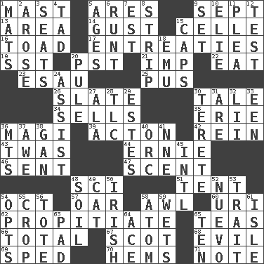 ACROSS 1. Vertical spar for supporting sails 5. Ancient Greek god of war 9. Back-to-school mo. 13. Type of rug 14. Abrupt rush of wind 15. Cell (Danish) 16. Frog relative 17. Pleas 19. Fast jet (abbr.) 20. Pacific Standard Time (abbr.) 21. Naughty child 22. Ingest 23. Son of Isaac 25. Fluid product of inflammation 26. Schedule 30. Lie 34. Makes a sale 35. 4th largest of the Great Lakes 36. Wise men 39. 13-14th century defensive garment 42. It's straight from the horse's mouth 43. It was, poetically 44. Bert's buddy 46. Transmitted 47. Aroma 48. _-fi 51. Portable shelter 54. Sep. follower 57. Boat paddle 58. Leather borer 60. RI univ. 62. Appease 65. Afternoon social gatherings 66. "_____ Recall" 67. Highlander 68. Morally bad or wrong 69. Broke a traffic law 70. Equivocates 71. Observe DOWN 1. Floor protectors 2. Came up 3. Theater features 4. Small amount or degree 5. Eons 6. The smallest animal of a litter 7. Eastern Standard Time (abbr.) 8. Remove all contents or possession from 9. Put into a specified state 10. Writer Wiesel 11. Entreaty 12. Trial 15. Balmoral and tarboosh 18. Australian flightless bird 20. Whimper 24. Help 27. Insect wing 28. Affectionate concern, for short 29. _____ Park, CO 30. Cigar-shaped 31. "We ___ not amused" (Victoria) 32. Cards in a Roman deck? 33. Car or cant ending 36. Mountains (abbr.) 37. Deep reverence 38. Separate the seeds from cotton 40. The grampus (Milton) 41. Compass dir. 45. International (abbr.) 48. Earth 49. Feline 50. From or relating to Ireland 52. New (sp.) 53. Distinguishing feature 54. Elects 55. Riding implement 56. Carryall 58. Tiny particle 59. Moistens 61. Small island 63. Groovy apt. 64. Adept person 65. "___ Little Indians"