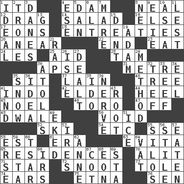 ACROSS 1. It would 4. Dutch treat 8. Be tempered by heat 12. To draw with force 14. Vegetable dish 16. Otherwise 17. Immeasurably long periods of time 18. Pleas 20. Approach 22. Conclusion 23. Ingest 24. French article 25. Assist 28. Scottish cap 30. Domed church section 31. Distance measurement (Brit.) 35. Be seated 37. (Had) reclined 40. Woody plant 41. Southeast Asian peninsula 42. A person who is older than you are 44. Person who is morally reprehensible 45. Christmas carol 46. "Corrida" creature 47. No longer planned or scheduled 48. A sleeping potion; an opiate (poet.) 50. State of nonexistence 52. What Jean-Claude Killy likes to do 54. And so on (abbr.) 55. Compass dir. 58. Eastern Standard Time (abbr.) 61. Period 63. Webber/Rice musical 65. Dwellings 70. Set down 71. Play the lead 72. Snob 73. Lacquered or enameled metalware 74. Hearing organs 75. Inactive volcano in Sicily 76. Elected rep. DOWN 1. Standard of perfection 2. Marketplace scale 3. Natives or inhabitants of Denmark 4. Compass dir. 5. Daniel's nick name 6. Keyboard modifier key 7. Female horse 8. Remaining after all deductions 9. Writer Wiesel 10. At sea 11. For fear that 13. Girls' org. (abbr.) 15. Gouge 19. First of billions? 21. Reproach for some lapse or misdeed 26. Small island 27. Started a card game 29. Mode 30. Ringlike coral islands and reefs 32. Unclean, religiously 33. Coral collection 34. Snakelike fish 35. Overwhelm 36. It may be bright or harebrained 38. Wedding promise 39. Effrontery 41. Working for oneself (abbr.) 43. Carrot, for example 49. Made supply last 51. Frozen water 53. Angers 55. Grain storage towers 56. Vertical member of a panel or frame 57. Eroded 58. Celtic language 59. Stalk of a moss capsule 60. Russian ruler of old 62. Singer Murray 64. Large container 66. Big collection agency 67. Small bed 68. Period of immesurable duration 69. R.R. building