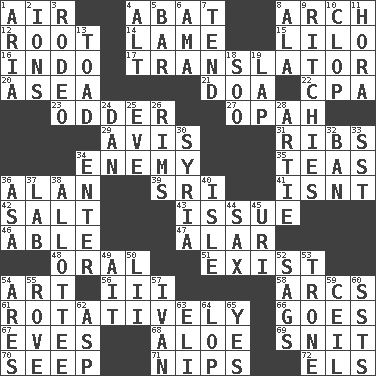 ACROSS 1. Wind 4. Blind as ____ 8. Bowlike part 12. Carrot, for example 14. Unable to walk 15. _ and Stitch 16. Southeast Asian peninsula 17. Interpreter 20. Toward the sea 21. ___ good deed 22. Numbers guy (abbr.) 23. More peculiar 27. Brightly colored fish 29. Opinion 31. Teases 34. Foe 35. Beverages made from leaves 36. Actor Alda or Thicke 39. Indian title of respect (Mr.) 41. Is not 42. Table seasoning 43. Come out of 46. Competent 47. Having or resembling wings 48. Relating to the mouth 51. Be 54. Nonscientific branch of learning 56. One more than two 58. Curves 61. Producing rotation 66. Travels 67. Nights before holidays 68. _ vera 69. In a ____ (agitated or irritated) 70. Ooze 71. Pinches, bites 72. Raised railways DOWN 1. Operatic vocal solo 2. Charged atoms 3. Cowboy competition 4. The first octave above the treble staff 5. Oblong piece of solid material 6. Nursemaid (var.) 7. Watch over 8. In the manner of 9. Actors Guy, Robert Welles, and Clint 10. Hoof sound 11. Israeli folk dance 13. Frog relative 18. "Barney Miller" actor Jack 19. Pet locale 24. Daniel's nick name 25. First lady 26. Basketball hoops 28. Nick name for Arthur 30. Damascus' land 32. Bar 33. Fast jet (abbr.) 34. Keyboard key 36. White ___ sheet 37. Experiment locale 38. One to whom something is allotted 40. Capri or Wight 44. Saxophone 45. RI univ. 49. Small island 50. Cards in a Roman deck? 52. Settles 53. Heavy duty weighing machine 54. Ancient Greek god of war 55. Be footloose 57. _ the terrible 59. To provide with a ceiling 60. Fast planes 62. Viper 63. Connecticut Ivy Leaguer 64. Chop off 65. It is so
