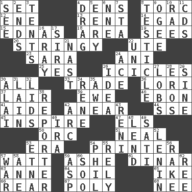 ACROSS 1. Arrange properly for use 4. Habitations of wild animals 8. Torque (variant) 12. Compass dir. 13. Monthly bill 14. Mild oath 15. Ferber et al. 18. Type of rug 19. Perceives with the eye 20. Slender, wiry 22. Shoshoni 23. "Two Mules for Sister ____" 24. Black tropical American cuckoo 25. It is so 26. Winter's stalactites 30. 100% 33. Swap 36. Australian parrot (variant) 37. Den 39. She-sheep 40. Inky black, to poets 41. Assistant 42. Approach 44. Compass dir. 45. Stimulate to action 47. Raised railways 50. The grampus (Milton) 51. Anneal 53. Period 54. Hard copy producer 57. Electrical Unit 59. American tennis player Robert 61. Middle Eastern gold or silver currency 63. Singer Murray 64. The visible part of the earth's surface 65. Mamie's husband 66. Stern 67. More than one (prefix) 68. Born DOWN 1. Perceive with the eye 2. Conclusions 3. Portable shelters 4. To be drawn or hauled along 5. Suggestive of the supernatural 6. Compass dir. 7. R.R. building 8. One of the two male reproductive glands 9. Double curve, resembling the letter S 10. Actress Charlotte 11. Music discs 16. Like ___ of sunshine 17. Male parent of an animal 21. Political cartoonist Thomas 22. Corn or form start 24. Adept person 26. The content of cognition 27. Tennis shots 28. Greek god of love 29. Trig term 30. Mountain range southwest of Kyrgyzstan 31. (Had) reclined 32. Hats (slang) 34. French philosopher Descartes 35. Deep reverence 38. News announcer 42. Curve 43. Painter Guido (1575-1642) 46. Lyricist Gershwin 48. Grant temporary use of 49. Suttee (variant) 52. Soviet premier 1918-24 53. Inactive volcano in Sicily 54. Silvers or Donahue 55. Have confidence or faith in 56. Libertine 57. Armed conflict 58. A saturated hydrocarbon 59. Viper 60. "Barney Miller" actor Jack 62. To riddle