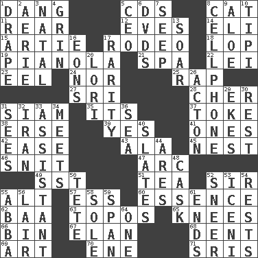 ACROSS 1. Mild oath, euphamism for damn 5. Music discs 8. Feline 11. Bring up, as a child 12. Nights before holidays 14. Connecticut Ivy Leaguer 15. Nick name for Arthur 17. Cowboy competition 18. Chop off 19. Player piano 21. Health resort 22. Luau accessory 23. Snakelike fish 24. And not 25. Reproach for some lapse or misdeed 27. _ Lanka 28. "Mermaids" star 31. Thailand, formerly 35. ___ a Wonderful Life 37. Casino tip 38. Celtic language 39. Affirmative reply 41. Singles 42. Relaxation 43. According to 45. Egg locale 46. In a ____ (agitated or irritated) 47. Curve 49. Fast jet (abbr.) 51. Afternoon social gathering 52. Title for a knight 55. Keyboard modifier key 57. Curvy letter 60. Center 62. Sound made by sheep 63. Literary convention 65. Leg joints 66. Storage container 67. Liveliness 68. Gouge 69. Tate display 70. Compass dir. 71. Indian titles of respect DOWN 1. Window treatment 2. Nest on high 3. Brizilian seaport 4. Smile widely 5. Corporate head (abbr.) 6. Movie discs 7. Ooze 8. Portable communications device 9. _ vera 10. Native american tent (variation) 13. Fly high 16. Immeasurably long periods of time 17. Noteworthy scarcity 20. Australian parrot (variant) 26. Gambison 29. Makes supply last 30. Respite 31. Observes 32. SW Asia republic 33. Aide 34. Confronts 36. Ocean 40. Chalkboards 44. Ancient Greek god of war 48. Keg 50. Wig 52. Scornful expression 53. Ancient Celtic tribe of eastern Britain 54. Musical pauses 55. Swedish rock group 56. Den 58. Not divided or shared with others 59. Connect, as a bridge 61. Conclusions 64. Single
